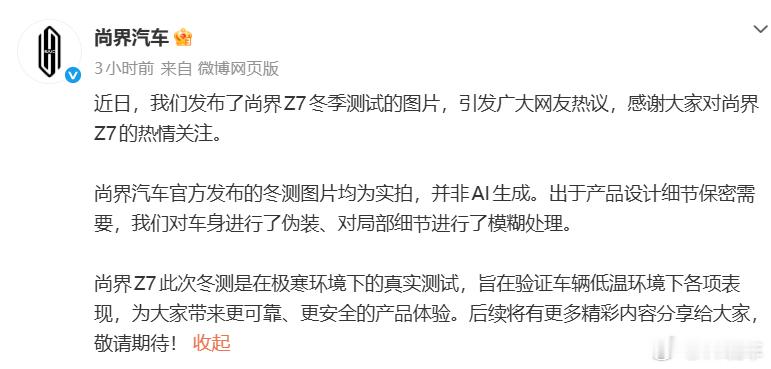 尚界z7 官方发声明了不是AI图,这个是不是我到不是很在意,只是从这件事上我发现,AI真的是检验智商的好东西。不要反驳我,就网上拿着一群ai生成的总结,然后传的沸沸扬扬的来看,AI是真的检验智慧的好东西。