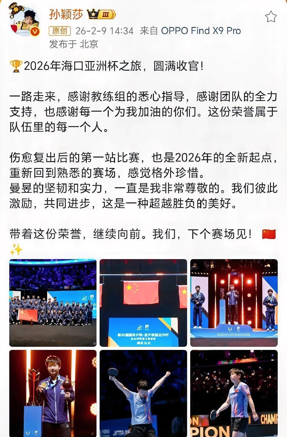 孙颖莎发文总结亚洲杯之旅, 除了感谢教练组和团队里的每一个人, 还特感谢王曼昱的坚韧和实力, 她们之间互相激励, 共同进步, 是一种超越胜负的美好。 孙颖莎不愧是我们的小太阳, 永远温暖所有的人。 铺天盖地擦边球事件, 她还不忘给别人体面。 既然没有鹰眼, 那莎莎就服从裁判的判定, 她都不纠结了, 我们也要学习她的大格局。 在赛后采访莎莎表示, 赢下王曼昱是自己幸运了, 观众的掌声她和王曼昱都值得拥有。 莎莎不止球打的好, 情商也很高, 表达能力也很强, 语言组织能力也是超棒。 两个顶级高手, 胜负毫厘间, 都是最优秀的世界级选手。 感谢孙颖莎和王曼昱, 给我们奉献了一场精彩的比赛。 (图片源自于网络)