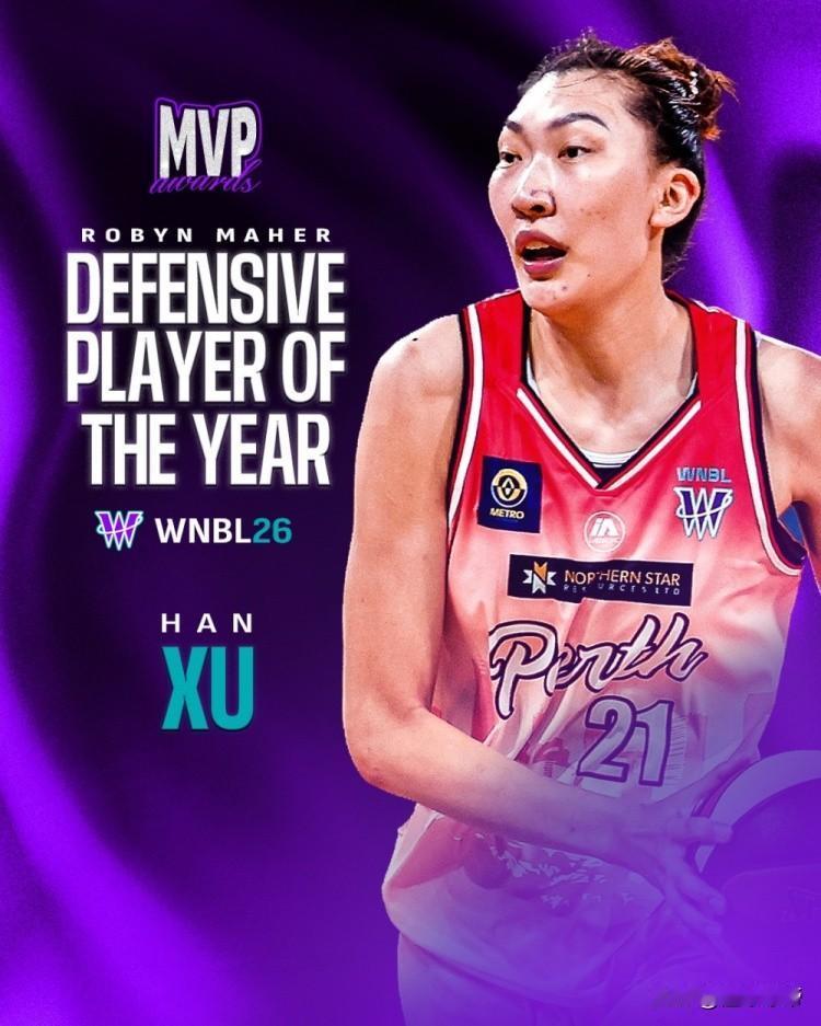 中国篮球的骄傲,韩旭当选WNBL联赛最佳防守球员! 刚刚澳大利亚女篮WNBL联赛官方宣布,效力于珀斯山猫的中国球员韩旭凭借本赛季场均15.8分7篮板2盖帽1.1抢断等我数据,当选联赛最佳防守球员。 韩旭是WNBL联赛历史上首位荣获最佳防守球员的非美国籍外援,这个含金量可以说相当高了,韩旭当初选择离开WCBA去国外打球真的是太对了,走出舒适区才能让自己变得更加强大,韩旭和李月汝为中国篮球做出了表率。 目前珀斯山猫在WNBL联赛常规赛取得了18胜5负的战绩排名联赛第二,期待韩旭能带领球队在季后赛表现更好,要是能夺冠那就完美了。