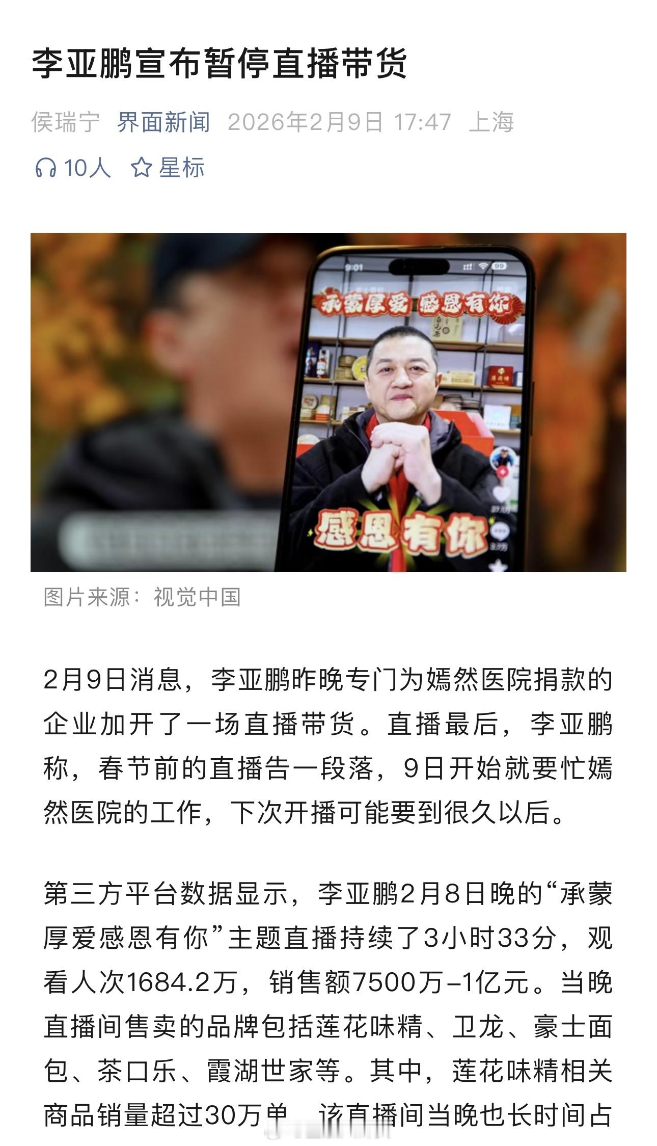 李亚鹏宣布暂停直播带货