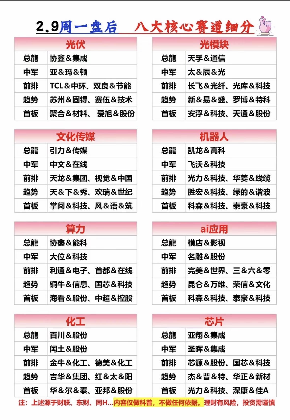八大核心赛道细分 周一盘后分析,助你投资决策! 八大核心赛道活跃:光伏、光模块领涨,文化传媒、机器人、算力、AI应用、化工、芯片跟涨,龙头股表现亮眼。