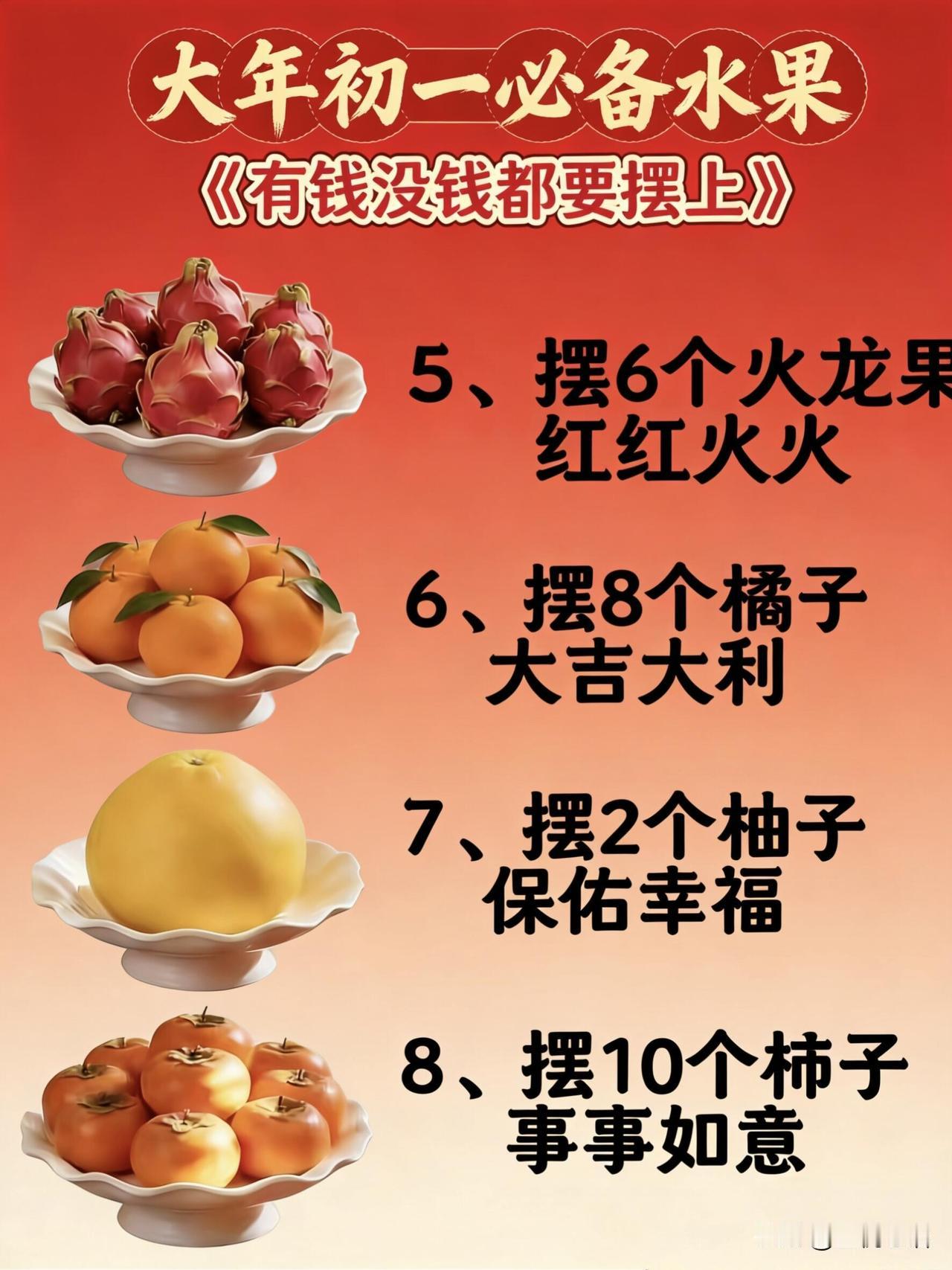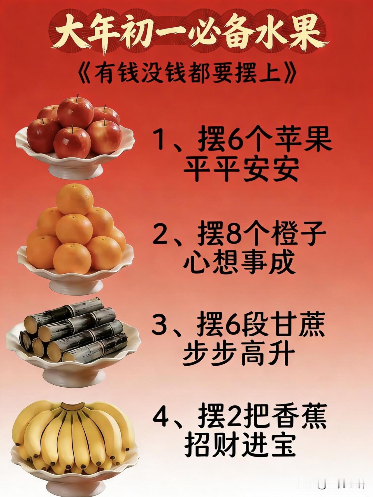 大年初一的水果摆盘 讲究的就是个好彩头 有钱没钱 这些水果都得摆上 年味一下就来了 6个苹果平平安安 8个橙子心想事成 甘蔗步步高升 香蕉招财进宝 火龙果红红火火 柿子事事如意 简单摆上几盘 把新年的美好期许都装进去 新的一年 吃着甜果果 日子越过越红火