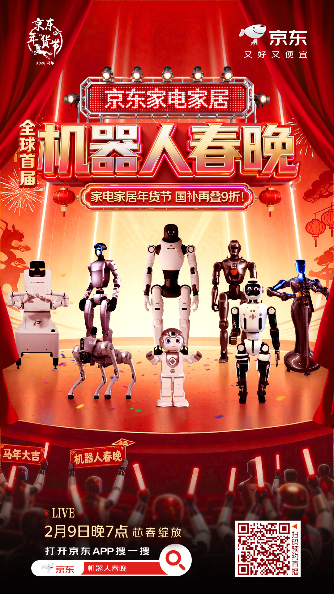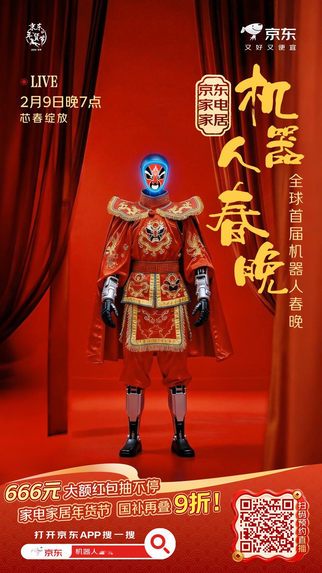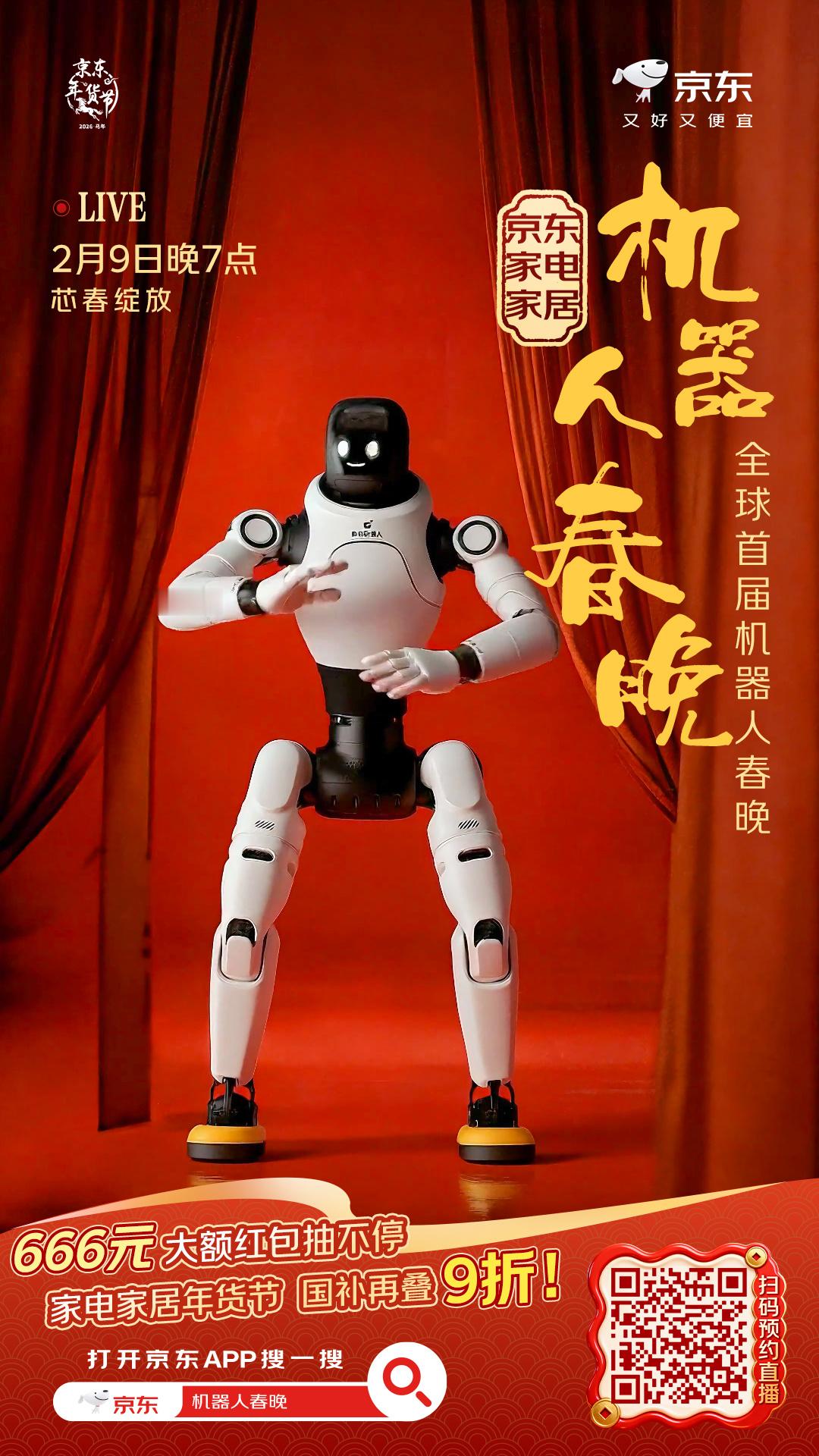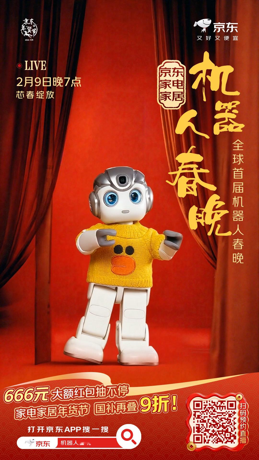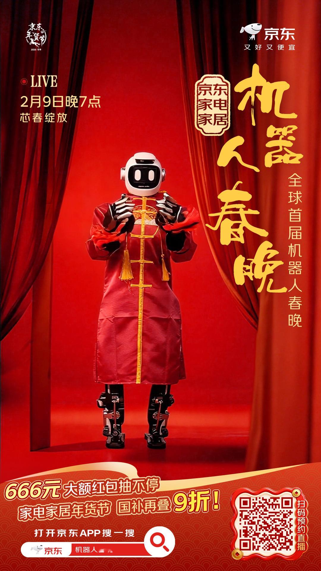 被海报上的机器人天团帅到了!🤖《机器人闹新春》开场走秀必须围观。赶紧上京东搜【机器人春晚】预约了2月9日晚7点的直播,听说能0元抽机器人试用,还有666元大红包拿。正好那天是小年,2月9日晚8点京东还有大动作,小年买年货来京东,2026元补贴人人可领!家电家居国补再叠9折。一边看直播一边买年货,美滋滋~➡️【网页链接】 小年上京东买年货领2026元补贴 京东买年货 又好又便宜 全球首届机器人春晚在京东年货节