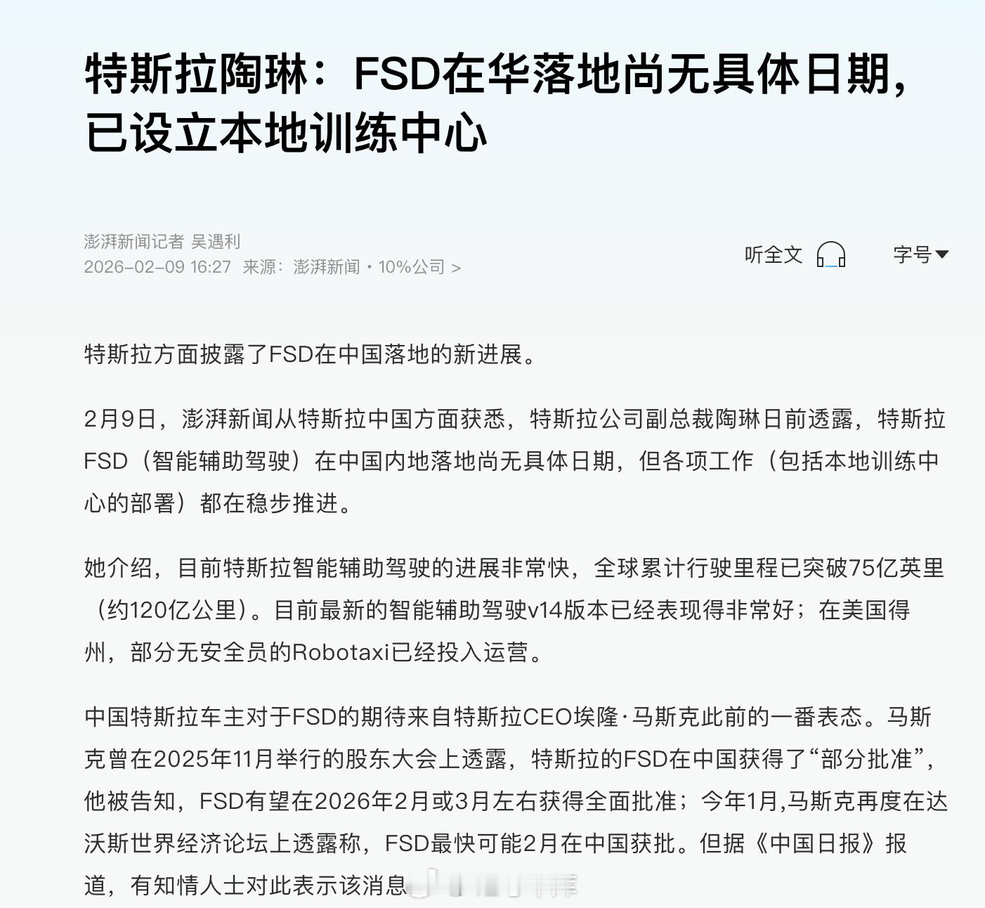 特斯拉陶琳:FSD 在华落地尚无具体日期。之前大家猜想的 3 月或者 2 月又得推迟了