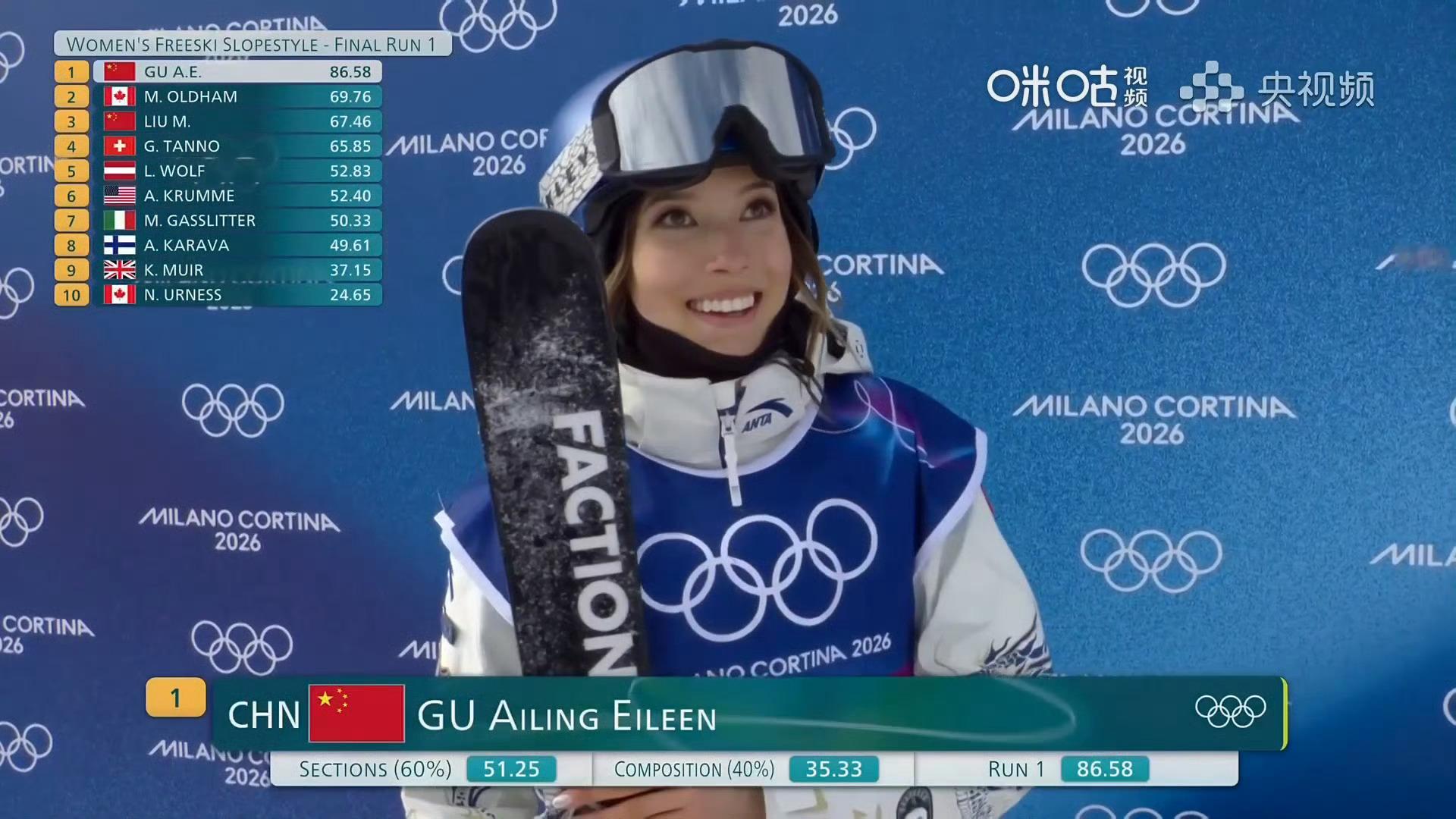 女子坡面障碍技巧决赛,就是谷爱凌和格雷莫德的H2H,两人第一跳后分列一二位,谷爱凌排第一!刘梦婷也非常棒排名第四,中国队冲击奖牌,甚至金牌开局完美。