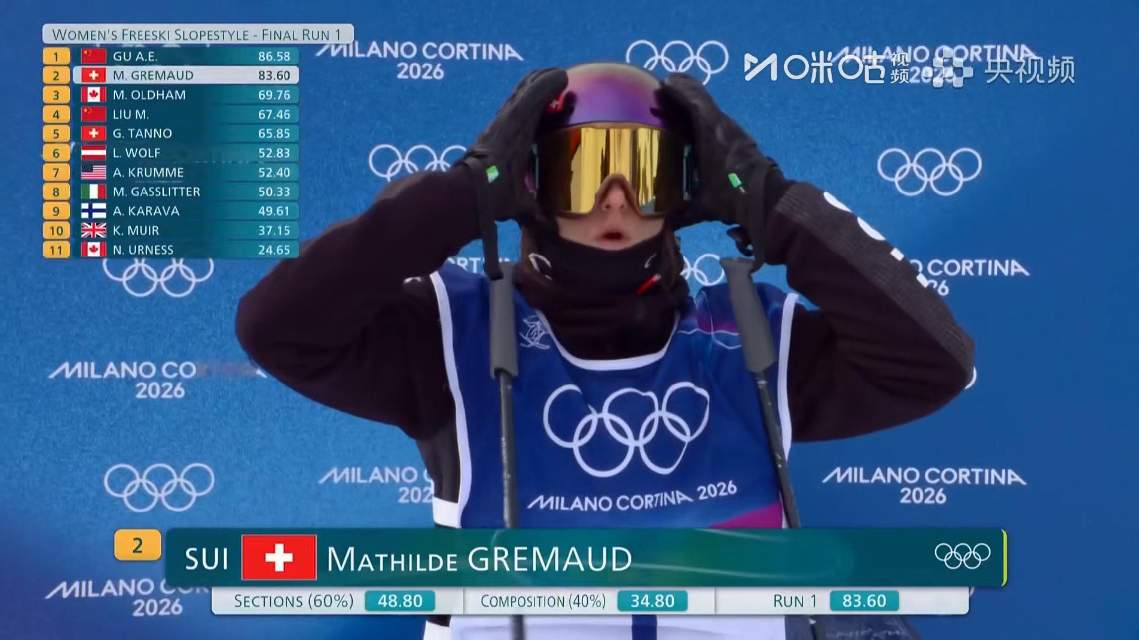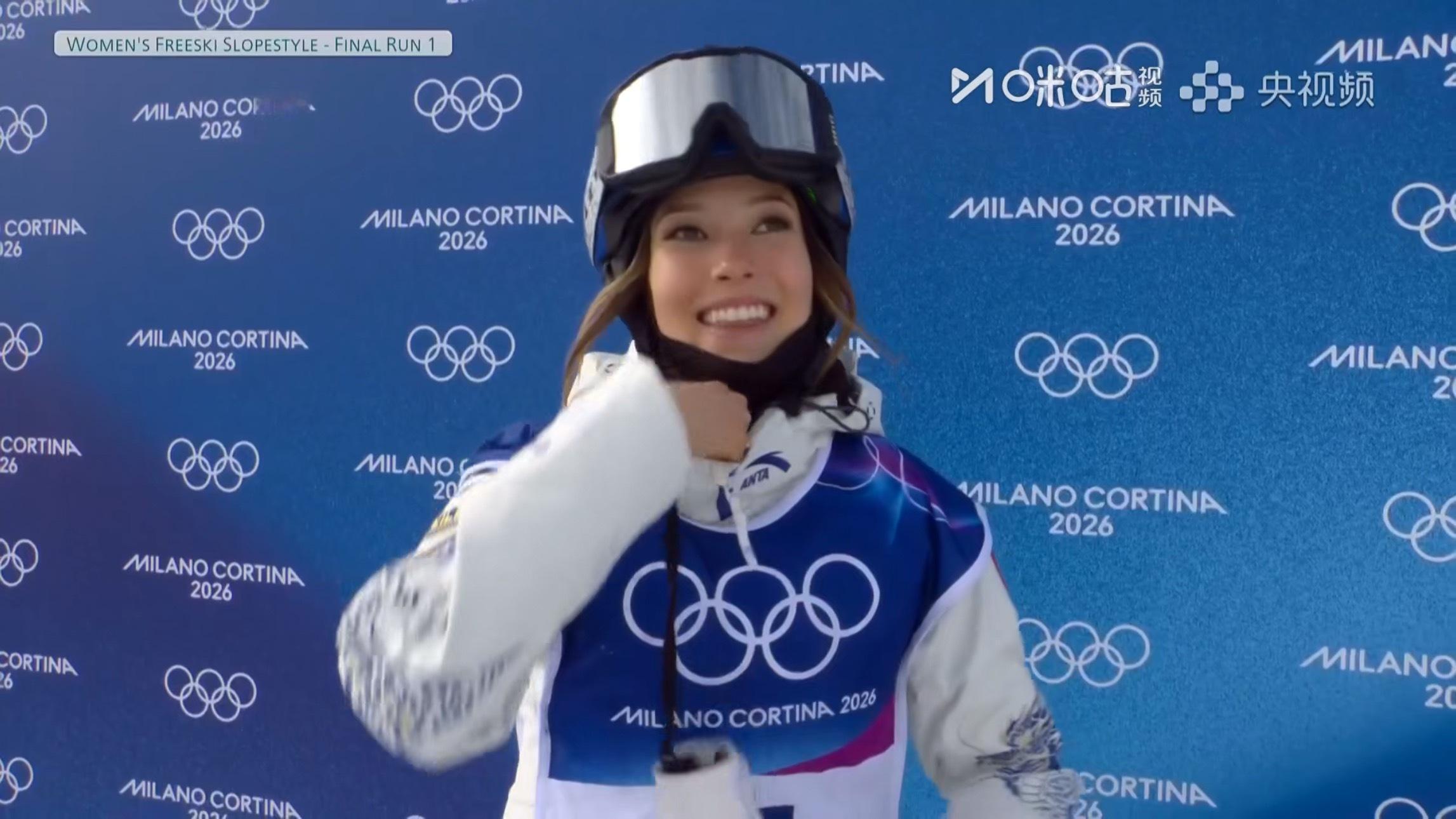 米兰冬奥会自由式滑雪女子坡面障碍技巧预赛,中国选手谷爱凌第二个出场,但她出现失误