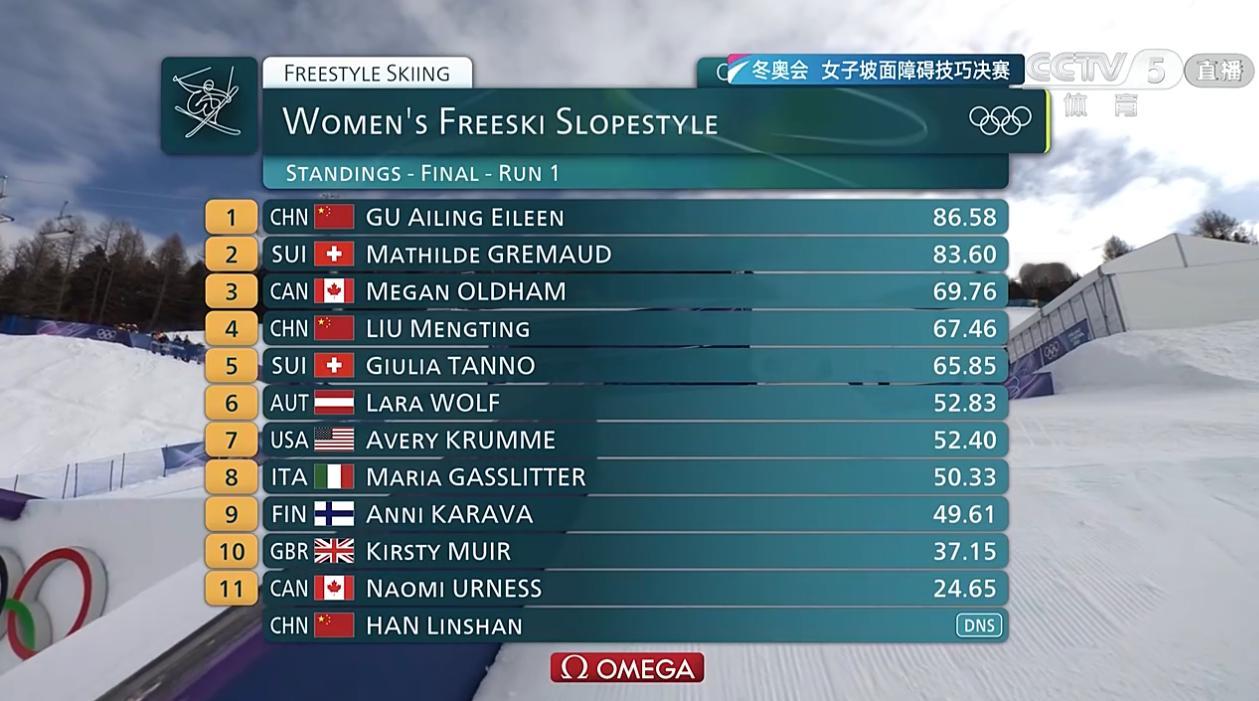 自由式滑雪女子坡面障碍决赛 谷爱凌第一次出发86.58分!还有两次机会刷分数!