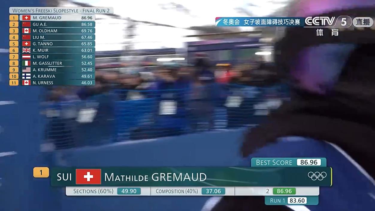 自由式滑雪女子坡面障碍决赛 谷爱凌第二跳失误,瑞士的格雷莫德拿出高难度动作,超到了第一位,只压了谷爱凌0.38分