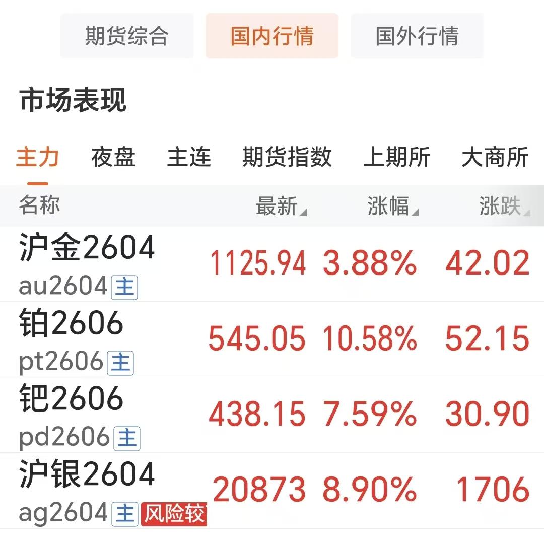 2月9日,星期一, 随着外盘金银等贵金属的上涨, 国内黄金白银铂金钯金等品种 跟随性上涨,你追我赶。 通过下图,可以看出: 沪金2604上涨3.88%,居然是涨幅最低的; 广期所的钯金2606上涨7.59%; 铂2606合约上涨10.58%,涨幅最大; 沪银2604合约,涨幅8.9%。 期货小褚认为本周贵金属有望继续上涨!
