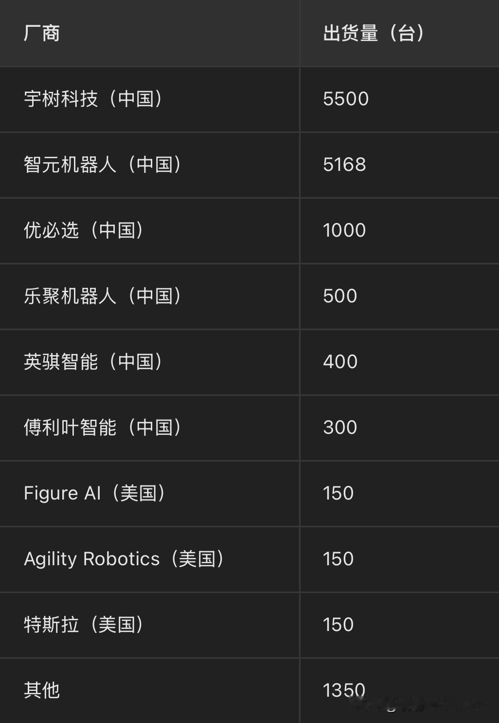 2025年全球人形机器人交付格局彻底明朗,中国厂商包揽近90%市场份额,形成碾压级领先。头部两家中国企业出货量均突破5000台,而特斯拉、Agility、Figure 等美国头部玩家,年出货量仅150台,中美商业化量产差距达到数十倍。 这也意味着,人形机器人行业已经告别技术秀场,进入量产能力、供应链效率、成本控制的实战阶段,中国军团凭借规模化落地能力,已经拿下全球商业化的主导权,海外巨头仍停留在小批量试产阶段,落地节奏全面落后。 人形机器人AI