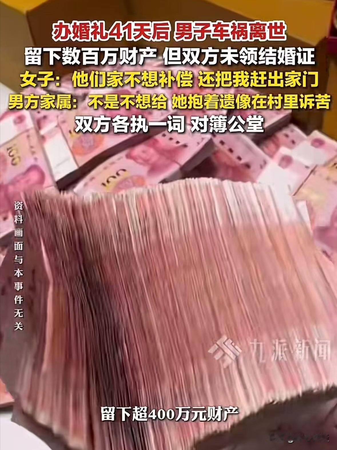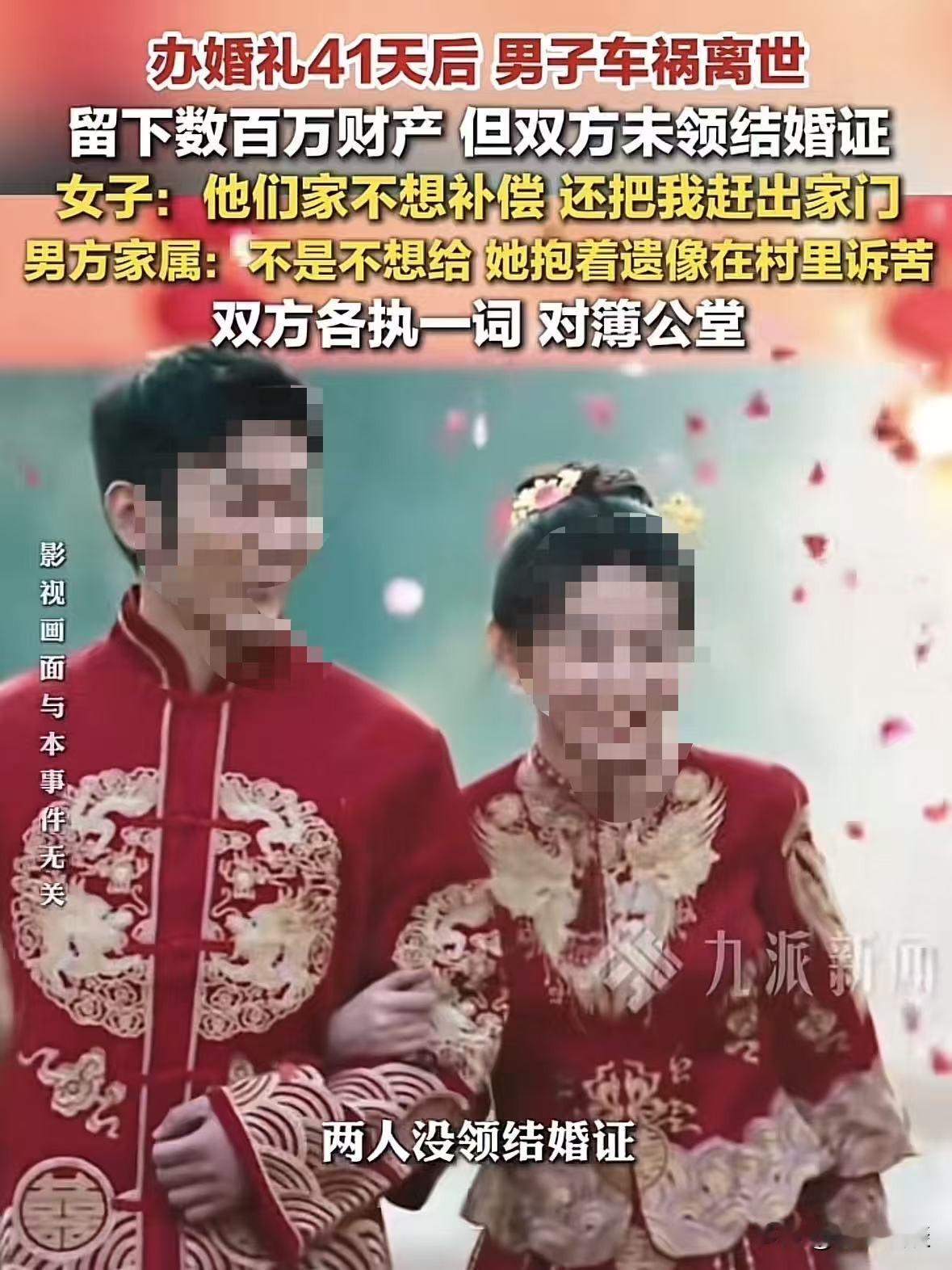 人心隔肚皮!山西朔州,一对夫妻刚办了婚礼,还没等领证,就出了车祸人没了,出事后,女子以妻子的身份为丈夫全程料理后事,谁知,事发以后,婆婆直接把赔偿金及存款全部转走,合计400万,还派了4个人把她赶出二人的婚房,但表示愿意给女子30万补偿,后来又反悔还起诉女子退还49.7万彩礼,女子气急,反诉婆婆,要求以妻子的身份分割一半财产! 张晓和余涛经朋友介绍认识,俩人都是奔着结婚谈的,谈了一段时间就同居了。 俩人平时互相照顾,日子过得也有奔头,后来俩人早就定好日子回家办婚礼。 因为想找个有纪念的日子领证,就打算先办婚礼后领证。 一切都安排得明明白白,后来婚礼办得热热闹闹,该走的流程一样没落下。 改口、敬茶、摆酒,全村人都知道张晓是余家的新媳妇。 可偏偏天有不测风云,婚礼刚办完41天,连热乎劲儿都没过去,意外就来了。 2025年6月11号,余涛上班途中,路上出了严重车祸,当场就重伤送医。 张晓接到消息,整个人都崩溃了,她守在余涛的病床前七天七夜,没合过眼,就盼着丈夫能醒过来。 可惜天不遂人愿,七天后,余涛还是因为伤势太重,没能挺过来,永远离开。 张晓作为刚过门的媳妇,强忍着撕心裂肺的悲痛,全程以妻子的身份料理后事。 回老家办葬礼,按照当地风俗,端灵、抱骨灰盒、打砂锅。 那时候,婆婆、婆家的亲戚,都一口一个儿媳、嫂子……张晓也没多想,内心觉得自己就是余家人,要替丈夫尽孝,送他最后一程。 后事办完,张晓还沉浸在失去爱人的痛苦里无法自拔。 让她没想到的是,婆家的态度,从这一刻开始,一百八十度大转弯,彻底变了脸。 原来余涛走后,赔偿款加上存款、理财一共加起来有400万。 婆婆一看这笔钱到账,心思立刻就活了,压根没想着张晓,偷着拿着余涛的手机把所有钱全都转到了自己名下。 张晓一开始还没察觉,等她发现的时候,已经全部被婆婆掌控,想要把她踢出局,独吞所有财产。 张晓找婆家理论,称自己与余涛办了婚礼、以夫妻名义共同生活,还全程料理后事,即便没领证,于情于理也该获得补偿。 婆婆起初松口愿给30万了结,张晓顾及亡夫家人情分,虽觉得数额少仍同意了,可婆婆转头就反悔,一分钱都不肯给。 更过分的是在余涛去世百天祭日的凌晨,婆婆竟派四名陌生男子闯入婚房。 打砸辱 骂、强行将张晓及其父母连人带物赶出家门,还更换了门锁。 张晓报警、找人调解都没用,婆家态度强硬,执意要将她赶出去。 这样还没完,婆婆还将张晓告上法庭,以两人未领证、婚姻不成立为由,要求她退还包含彩礼、改口费、五金等在内的49.7万元。 张晓得知后怒不可遏,她满心委屈,自己恪守儿媳本分、妥善处理后事,如今却落得被夺财赶人、反被追讨彩礼的下场。 张晓看透婆家唯利是图、绝情寡义的真面目后,张晓不再念及情分,果断提起反诉。 主张以妻子身份分割余涛约半数财产,共计200多万。 《民法典》第308条:同居财产以各自所有为原则,共同共有为例外。 共同出资、共同经营、无法区分的财产,按出资比例并结合贡献、共同生活时长等分割。 张晓可主张同居期间共同存款、理财、婚房首付与共同还贷部分。 需举证共同出资与贡献,如转账记录、还贷凭证、参与经营记录等。 目前,该案已经开庭审理,但是暂未宣判。 不得不说,结婚办婚礼再热闹,都不如一张结婚证管用。 但更让人唏嘘的是,人心隔肚皮,再好的感情,再亲的家人,在巨额财产面前,也可能露出最丑陋的一面。 说到底,钱是身外之物,情分才是最珍贵的。 婆家为了400万,丢掉了良心,丢掉了人情,就算拿到了钱,这辈子也活在愧疚和非议里。 而张晓,守住了自己的底线,捍卫了自己的权益,就算过程艰难,也问心无愧。 希望最后能有一个公正的处理,能让张晓在失去爱人后,能得到一丝慰藉,别让这世间的凉薄,寒了所有真心人的心。 对此,你怎们看这件事? @静心法谈 学法辨是非,慬法不吃亏。