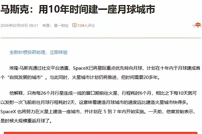 马斯克要在月球建城市?这事儿可不简单! 2月8日,马斯克宣布SpaceX将重点转向在月球建设一座“自我生长的城市”,且有望在不到10年内实现。此消息一出,瞬间引发热议,有人调侃马斯克是“画饼大师”,但这看似天马行空的计划,背后或许藏着巨大机遇。 马斯克称,相比火星,月球发射窗口每10天就有一次,行程仅2天,能更快保障文明未来,所以优先选择月球。而且SpaceX已展示过月壤3D打印等技术概念验证,为建城奠定了一定基础。 从马斯克的动作来看,全球太空竞赛可能会进一步升温,国内登月进程也有望加速,商业航天将迎来新的发展契机。这不仅是马斯克个人或SpaceX的计划,更可能带动整个航天产业链条的发展,从火箭发射到月面通信,从空间制造到资源勘探,每一个环节都蕴含着无限商机。 对于中国商业航天而言,这是挑战更是机遇。国内企业若能借势发力,在材料、通信等细分领域取得突破,有望在全球航天市场占据一席之地。也许,未来10年,我们真能看到月球上崛起一座人类城市,而商业航天也将成为下一个经济增长新引擎。拭目以待吧!