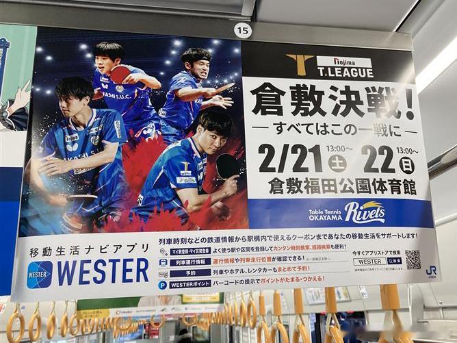 “🚃冈山全县 JR 车厢内火热张贴中🔥冈山铆钉仓敷主场收官战的电车吊环广告上线啦🔥通勤、上学路上看到的话,一定要来报个信哦🙌仓敷决战,咱们赛场并肩应援🏓🏓2 月 21 日(周六)、2 月 22 日(周日) 13:00 开赛📍仓敷福田公园体育馆”(机翻)Cr: 冈山