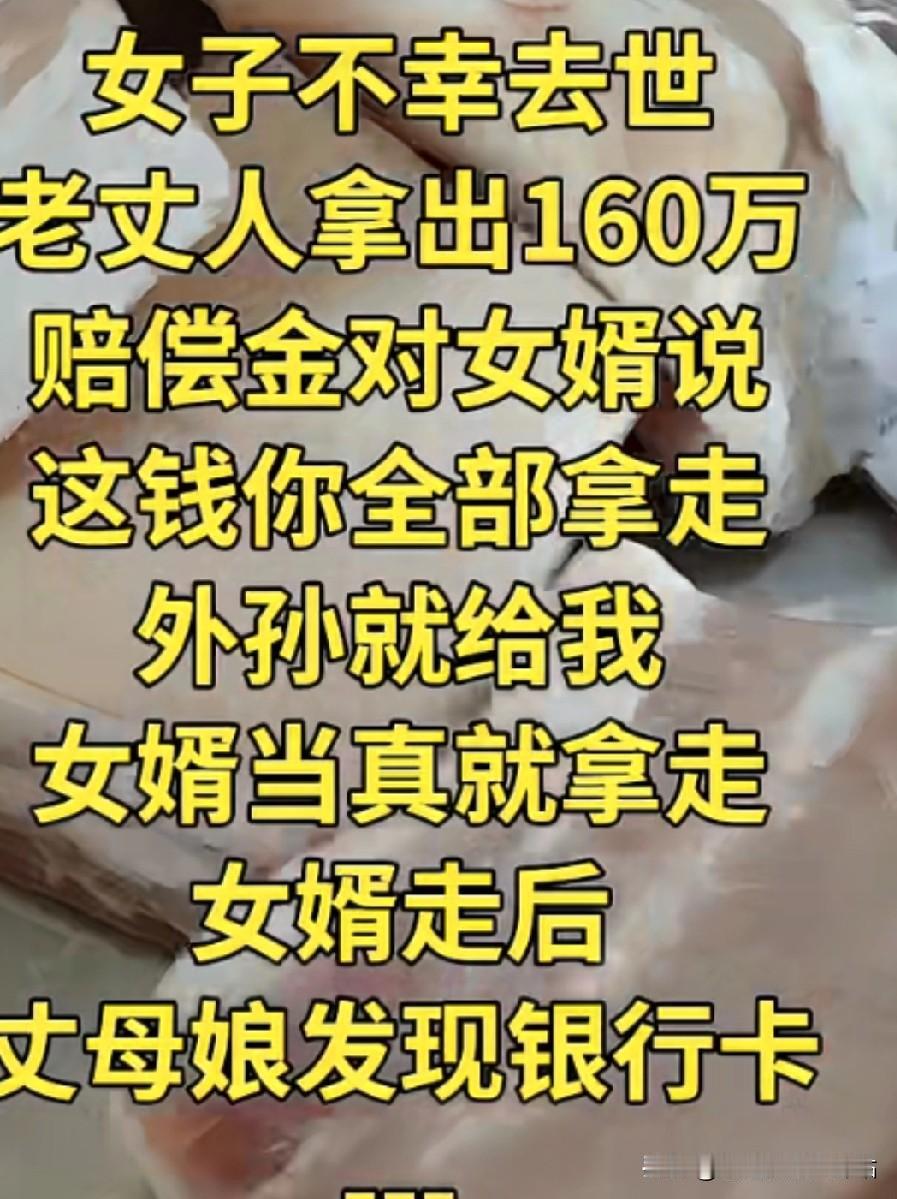 女子不幸意外过世,女婿备受打击,但还是坚强地处理他老婆的出殡事宜。可是刚过完头七,女婿却突然表示要离开这个家。 他拿出一张银行卡对两个老人,说保险公司赔了150万,我拿30万,剩下120万,留给你二老养老吧!女子是独生女,老丈人曾花费大量积蓄给她买房和买车。 女婿是出生于农村,学历不高,长相也一般,除了性格好点,老丈人并不是很喜欢他。 从结婚到现在,从未没正眼看过他,因为他是上门女婿,丈母娘承认也看不起他,毕竟她女儿是那么的贤惠,觉得他配不上自己的女儿。 然而,如今唯一的女儿已经不在了,俩老唯一的念想就是外孙子,希望他能留在俩老身边,给他们家留个后。 让两个老人有个寄托,老丈人对女婿说,钱你可以拿走,但孩子必须留下。我和你丈母娘才也才65岁,还算年轻,你把孩子留给我们,你自己再娶也好,自己一个人也好,至少没有什么拖累你的,就这样外孙子留下来了。 女婿当时没有回应,老丈人知道他面对这么多钱的诱惑也很难。没想到几天后,他果然带着钱走了,把孩子留给我们。 后来老丈人才知道,女子在意外发生前已经和她老公闹得要离婚。原来是女儿犯了错被他发现了。 因为房子和车子都是婚前买的,女婿开始时表示只带走孩子。亲戚提醒我,女婿不可能只拿30万,说不定他偷偷藏钱。老丈人开始着急,赶紧翻出女子留下的一些遗物,如房产证、银行卡、保险单等。 然而,房产证都在,银行卡最后提取的时间显示是女子生前取的,保险单上面写着只赔付了150万。女婿把钱和孩子都留给老丈人俩老,净身出户了。 老丈人感到非常愧疚,于是给女婿打电话说:“傻孩子,你把钱都给了我们,你怎么生活啊?”女婿回答让老丈人心疼,他说:“我可以自己挣钱。至于孩子,你们是他的外公外婆,交给谁都没有交给你们放心。 我的孩子我想看随时都可以回去看,站在你们的角度,我能理解你们的心情。”女婿的话让老丈人深感羞愧和感动。老丈人表示女婿毫不计较地把所有的钱都给了他们,还把外孙留给了他们。 老丈人明白了自己的错误,并开始更关心孙子和女婿。 我认为,关爱老人和育儿是人生中最重要的事情之一,我们应该更加去珍惜和爱护身边的人。