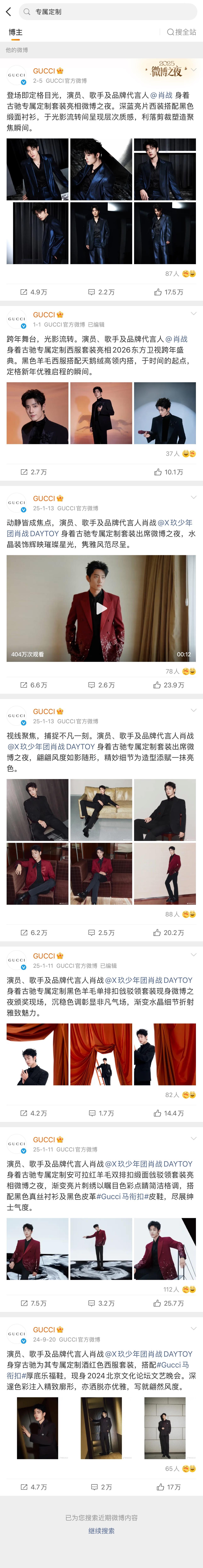 震惊,在GUCCI微博主页搜“专属定制”仅有7条微博5套衣服,肖战一个人。 什么是排面和咖位,这才是。