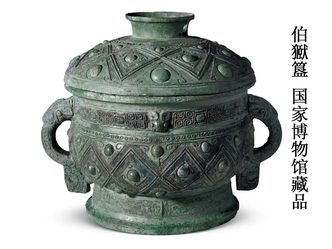 2013年,2件伯㺇簋、1件㺇盘和1件㺇盉由中国国家博物馆征集入藏。 近介绍伯㺇簋,两件伯㺇簋的形制、纹饰、铭文近似,尺寸也基本相同。通高24.5厘米,口径24厘米。侈口,束颈,口沿上唇尖凸,盖沿中部内凹,形成子母扣,腹部略鼓,圈足外侈并连接直立形矮阶,颈腹两侧饰一对兽首耳,耳下有方形垂耳,盖面隆起,顶部有圈形捉手。颈部饰一周目雷纹,前后增饰浮雕兽首,其下饰一周连珠纹,盖面和器腹饰斜方格乳钉纹,圈足饰饕餮纹。 伯㺇簋年代由同形制器物断代,伯㺇簋的形制与1954年发掘的陕西长安普渡村长甶墓五号簋相近。据墓内出土铜器铭文“穆王在下淢居”,可知器物铸于穆王生时,而其埋葬年代在西周恭王初年,墓中随葬簋的年代应相去不远,约在穆王后期。 伯㺇簋盖内铸铭文68字,重文1字,器内底铸铭文16字,重文2字, 器铭文释文: 肇乍(作)朕文考甲公寳(宝)【将鼎】彝,其日夙夕用厥馨香敦示于厥百神,亡不鼎(则)。 器铭文大意:作器者“肇”为其先父甲公制作了这件簋,用于日夜祭祀祖先且不忘记。 盖铭文释文:㺇肇乍朕文考甲公宝(将+鼎)彝,其日夙夕用厥馨香敦示于厥百神,亡不鼎(則)。肆夆馨香則登于上下,用匄百福、邁(迈,万)年,俗(裕)兹百生(姓),亡不鬱(郁)临(凼+夆)鲁。孙孙子子其迈(万)年永宝用兹彝,其(言+枼)母(毋)望。 盖铭文大意:作器者“肇”为其先父甲公制作了这件簋,用于日夜祭祀祖先且不忘记。“肇”在成周国社祭坛上下摆满以鬯酒和黍米进行祭拜先祖,并祈求福禄、长寿、百姓富裕,希望子子孙孙永远保有这件青铜器,永世不忘。