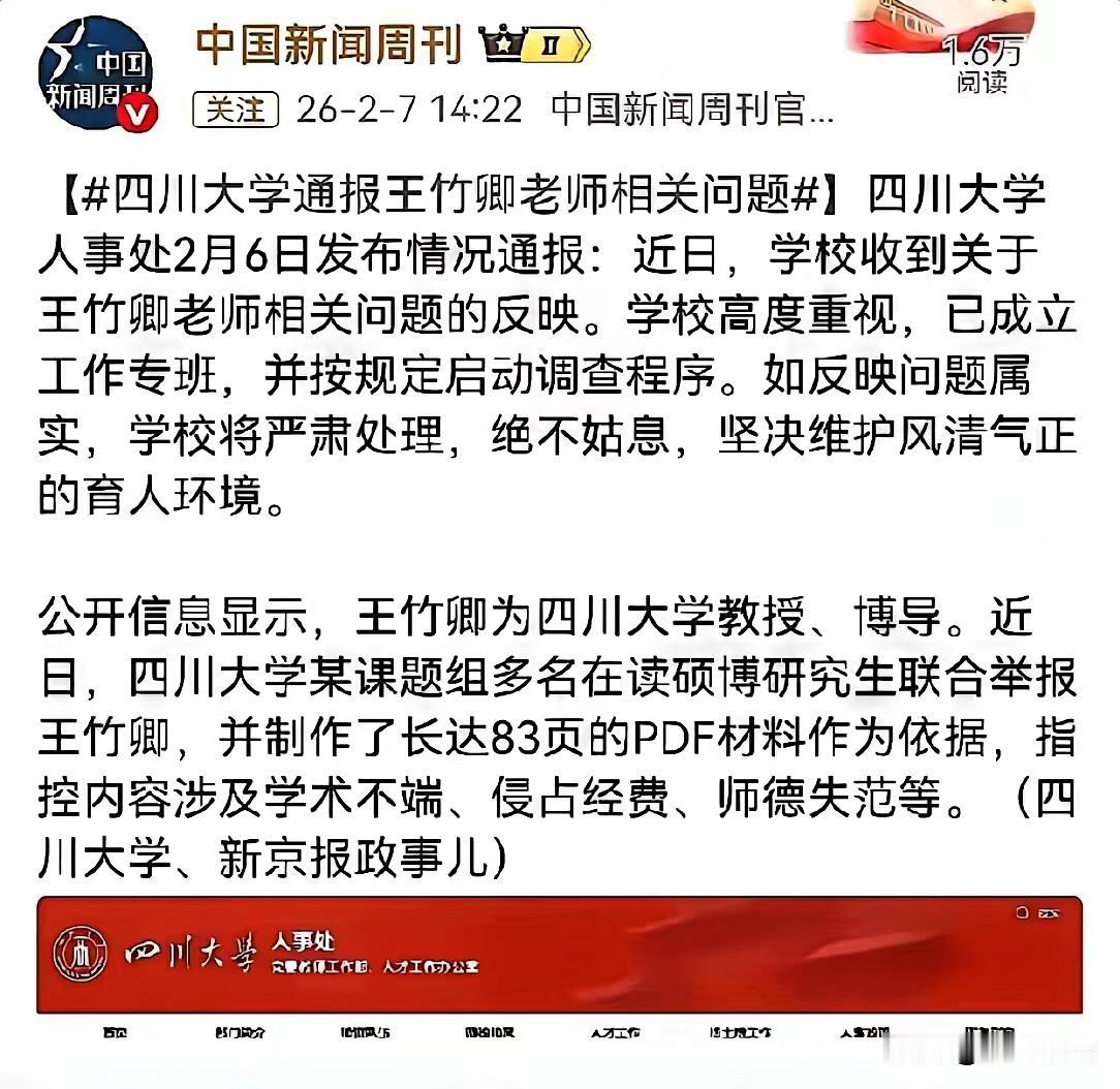 别拿“导师”身份当免死金牌! 王博导放狠话要送律师函,学生硬刚“奉陪到底”。这哪是师生矛盾?分明是学术圈权力霸凌的撕破脸。 学生敢拼上前途举报,背后必然是忍无可忍。 83页举证材料不是闹着玩,学术造假、经费挪用、师德失范桩桩具体。 都2026年了,还想用“延毕”“封杀”拿捏学生? 真当学术圈是一言堂,规矩是给旁人定的? 给女学生点赞喊美女是小事,但背后藏着的权力傲慢才吓人。 拿着国家经费当私人小金库,踩着学生肩膀换学术头衔,这种蛀虫早该清理。 学术圈的干净,要靠实打实的调查撑腰。 川大敢不敢查到底,能不能还学生公道? 你觉得这事儿最后会怎么收场?评论区唠唠!