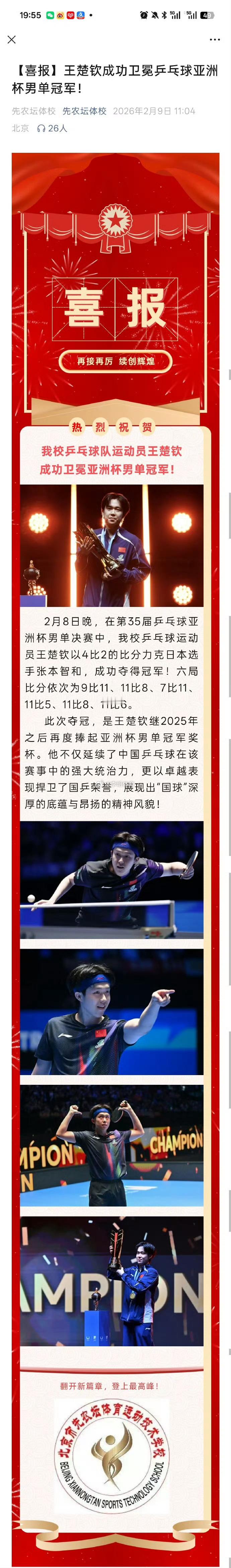先农坛体校又给王楚钦发喜报了