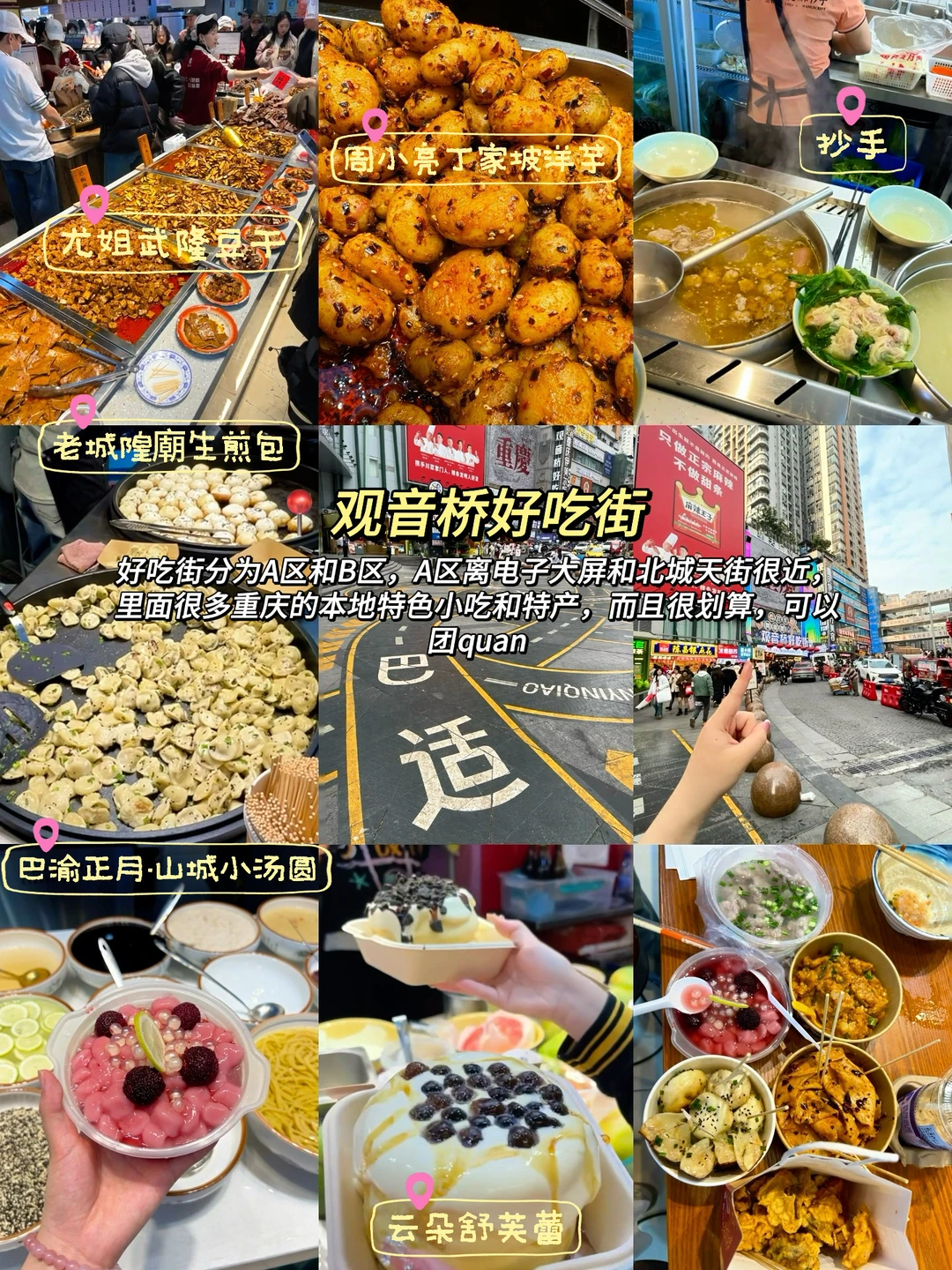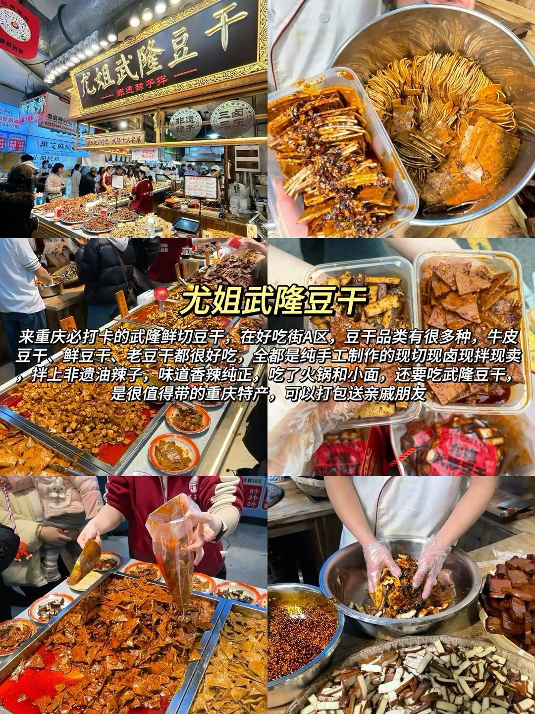 逛累了可以在观音桥好吃街品尝重庆特色美食和小吃,品类有很多,想吃什么可以先试吃,不怕踩雷,不好吃是可以退💰的,直接一整个在里面大吃特吃,尤姐武隆豆干和周小亮丁家坡洋芋都很不错,很多本地人都爱吃,种类有很多可以慢慢挑哦