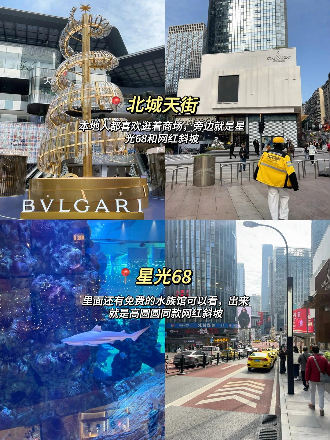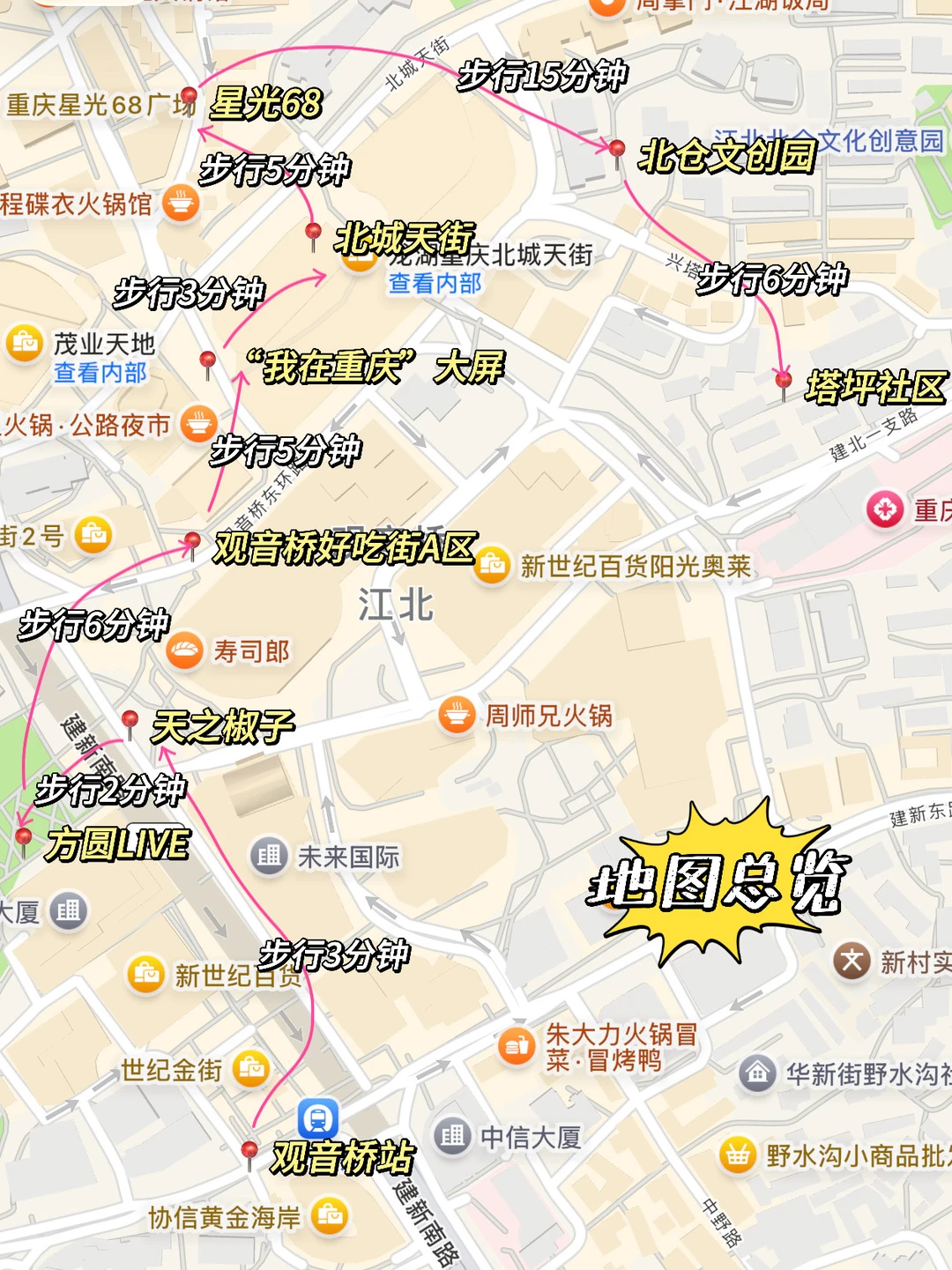 观音桥轻轨站➡️“天椒之子” ➡️方圆LIVE➡️观音桥好吃街➡️“我在重庆”大屏➡️北城天街➡️星光68➡️北仓文创园➡️塔坪社区