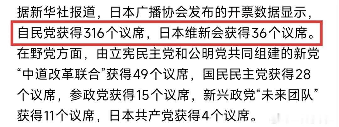 在昨天举行的日本议会大选中,自民党与维新党,总共获得352席,远超2/3绝对多数,在野党仅得到113席,高市早苗将继续执政。
