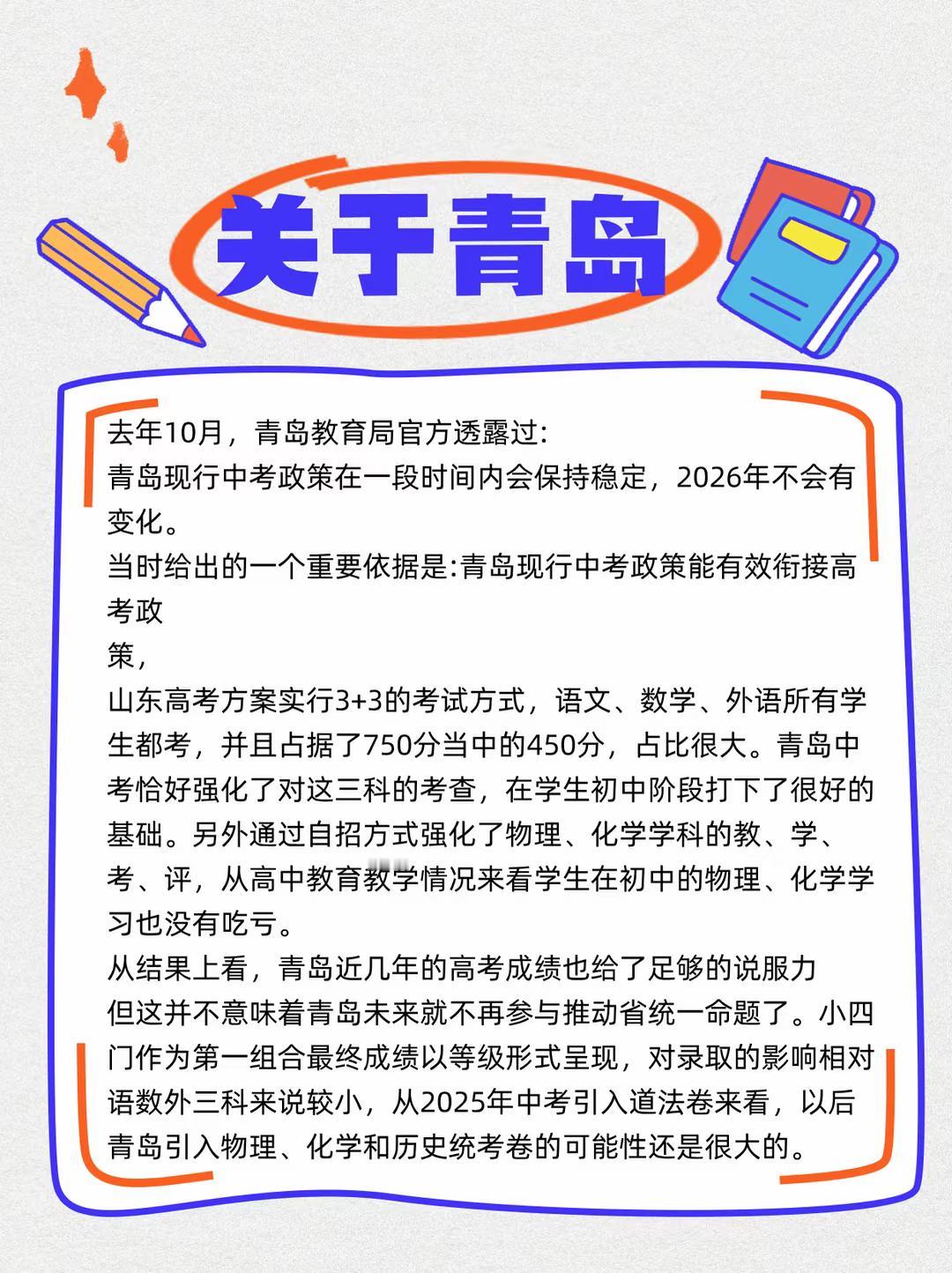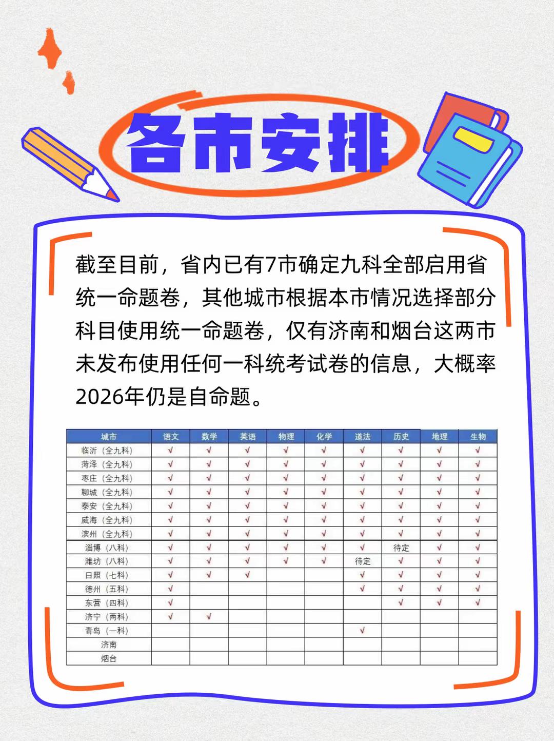 青岛,中考关键信息! [鼓掌]今年部分地区九年级期末,英、史、地、生四科已用省统考卷,这四科将正式加入 2026 年山东中考省统一命题范围,中考九科自此实现全省统一命题。省统考试卷具体是否启用,以各市教育局通知为准。 青岛教育 青岛升学 青岛家长 中高考 中考志愿填报 青岛初中 青岛初升高