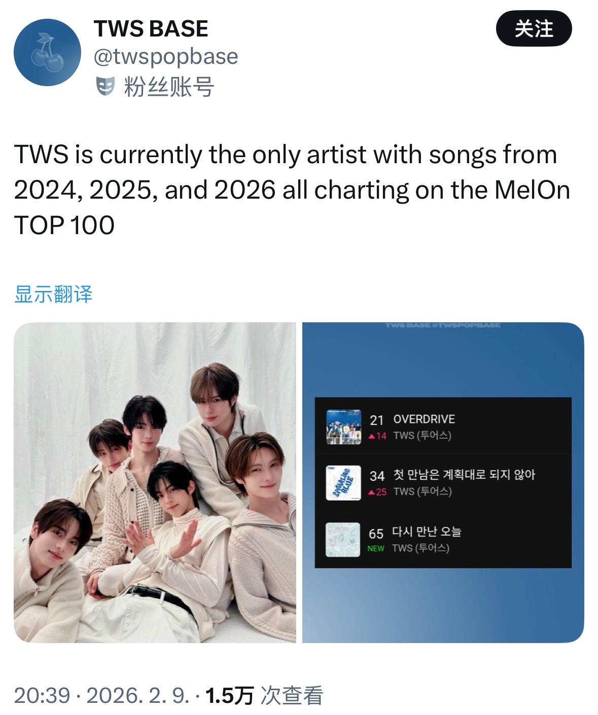 现在Melon TOP100入榜了三首主打曲的TWS🔥2024年1月出道曲《Plot Twist》2025年10月迷你4辑主打曲《Overdrive》2026年今天发行的数码单曲《再次相遇的今天》