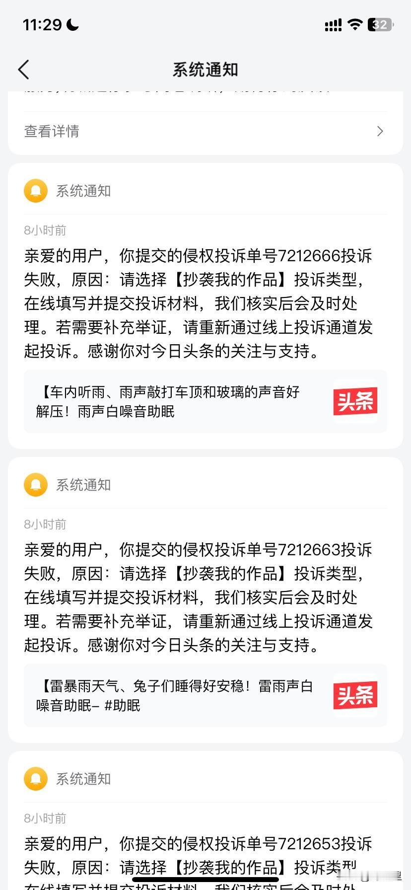 今日头条有活人工吗? 我的视频被头条号搬运了好多好多,就是这个用户为:左岸的风车,真是厚颜无耻,直接偷取我辛苦创作的白噪音视频,10几条投诉都失败,我都怀疑是不是没有活人工了,都是机器回复,然后人工的时候就挂断! 针对这种偷我视频,直接搬运的盗窃行为,头条如此容忍吗?不给处理吗? 我投诉搬运,让我改成抄袭,我改抄袭又提交不了,要么就是提供后台操作,提供了我的后台操作截图,仍然失败…… 这么大的头条,处理不了一个偷盗视频的账号吗? 认真看了下,从2025年9月开始搬运,我真是无语…… 头条能不能给我处理?给我个结果?否则,可信度何在?道德在哪里?人文?企业文化在哪里? 请大家作证,请头条出来处理,你的用户存在盗窃行为,为何不予以处置????是包庇,纵容吗?还是不作为???