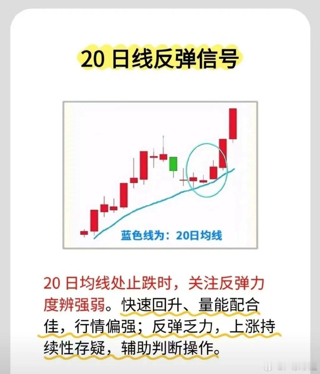 20日反弹核心信号:以20日均线趋势+K线形态+量能+辅助指标共振为准,分为趋势内回踩与下跌后转折两类,止损明确、成功率更高。 一、核心信号类型与判定 1. 上升趋势回踩反弹(高胜率)20日均线向上抬升(斜率明显),股价多数在均线上方。K线回踩20日线附近(误差≤2%),收小阳/十字星/长下影,不创新低。回踩时缩量(较前5日均量缩30%+),反弹时放量(较缩量时增50%+)。辅助:5日线不下穿20日线、MACD无死叉、红柱未消失。入场:回踩次日收阳且放量,突破5日线时买入。2. 下跌后转折反弹(博弈性)20日均线由下走平/微翘,不再持续下行。股价放量站上20日线(收盘价超3%+,较前5日放量50%+)。突破后3-5日内回踩20日线,缩量企稳(误差≤2%,较突破日缩量40%+)。辅助:KDJ低位金叉、筹码低位密集无松动[__LINK_ICON]。入场:回踩当日/次日收阳,分时止跌回升时介入。 二、止损与风控 止损:买入价下方3%,或有效跌破20日线(收盘价破+放量+均线拐头),立即离场。仓位:趋势内回踩可至5-7成;下跌后转折≤3成,待突破前高再加仓。过滤:大趋势向下(如60日线空头)时信号谨慎用,优先选60日线上方的票。 三、快速识别口诀 20线向上,回踩缩量收小阳,放量突破就进场。20线走平,放量站上再回踩,缩量企稳是拐点。