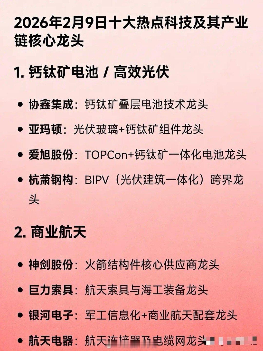 2026年2月9日十大热点科技及产业链核心龙头盘点:1.钙钛矿电池/高效光伏协