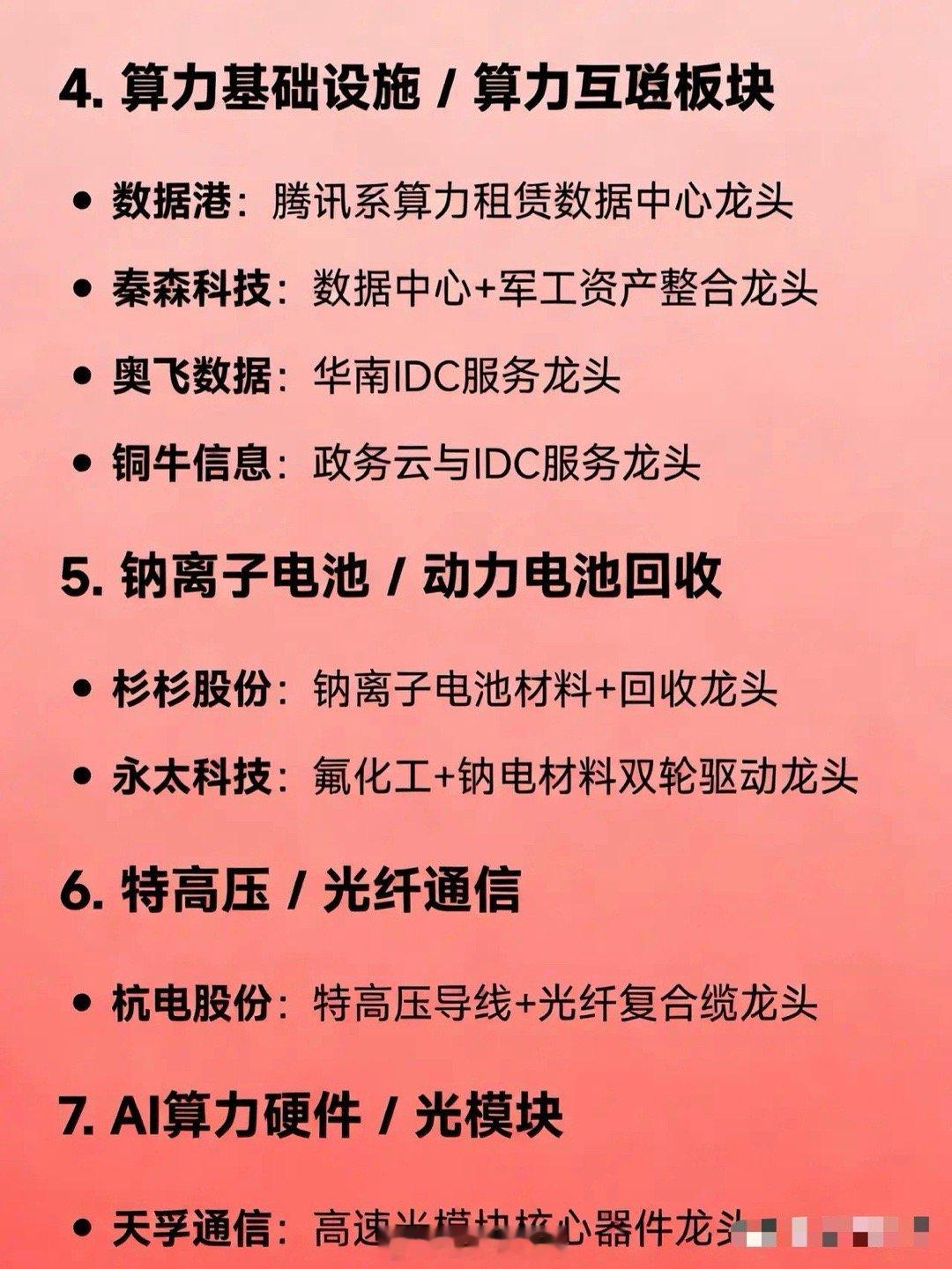 4. 算力基础设施/算力互联互通数据港:腾讯系算力租赁核心,数据中心规模居前秦森科技:数据中心+军工资产整合,多元业务协同发力奥飞数据:华南IDC服务龙头,算力调度能力强铜牛信息:政务云与IDC服务标杆,安全合规优势显著