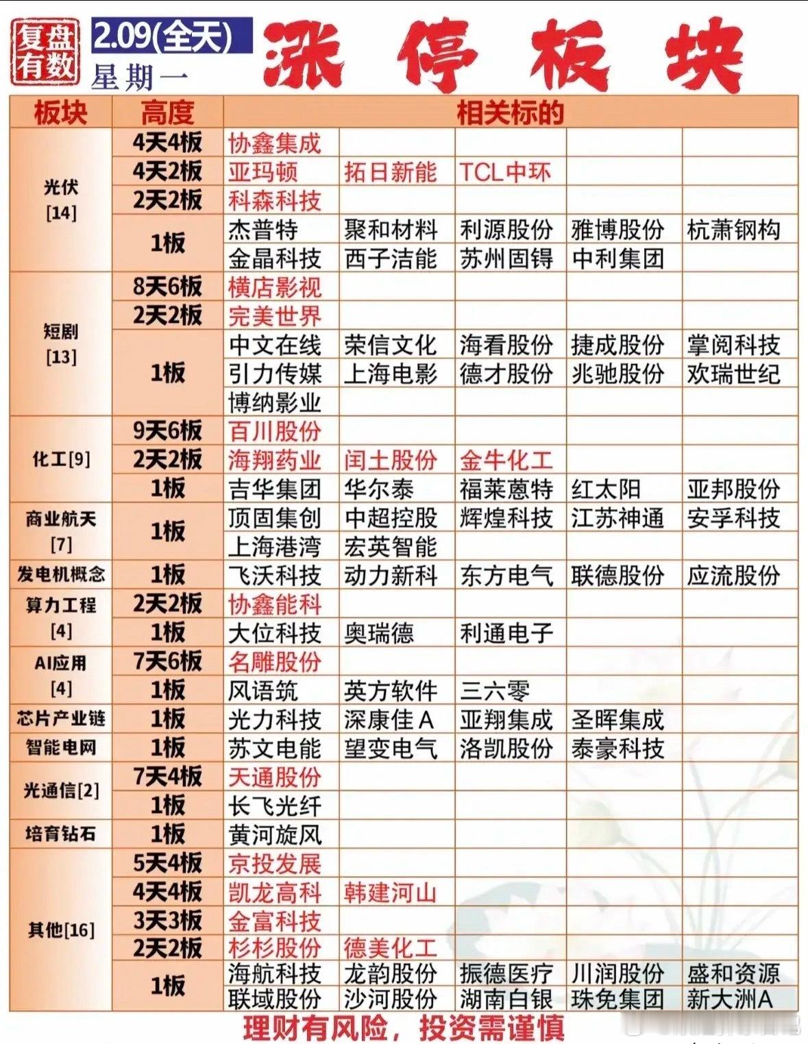 今日涨停梯队呈现多板块轮动、高标引领的特征。短剧、光伏、化工为涨停家数最多的三大板块,其中短剧板块的横店影视(8天6板)与化工板块的百川股份(9天6板)是市场最高高度标的,光伏板块则以协鑫集成(4天4板)为连板龙头,同时AI应用、光通信等板块也有高标标的支撑情绪。整体梯队结构完整,既有高标连板引领情绪,也有2天2板、首板标的补涨,板块内联动性较强,资金聚焦题材热点与景气赛道。个股梳理分析1. 横店影视:短剧板块核心标的,近期依托短剧内容热度与行业催化走出8天6板行情,是市场短线情绪标杆,带动板块内多只标的涨停,影视传媒属性突出。2. 百川股份:化工板块高标,主营化工新材料业务,凭借产业链优势与市场需求走出9天6板走势,为板块领涨标的,带动化工相关个股跟涨。3. 名雕股份:AI应用板块高度标的,涉及家装数字化等AI业务,依托行业需求与技术应用走出7天6板行情,是AI方向短线核心标的。4. 协鑫集成:光伏板块连板龙头,主营光伏组件业务,受益于行业景气度提升与产能释放走出4天4板,带动光伏板块多只标的涨停。5. 天通股份:光通信板块高度标的,主营光电子器件业务,依托光通信产业链需求增长走出7天4板行情,为光通信方向领涨标的。6. 京投发展:其他板块连板标的,主营房地产业务,凭借题材催化走出5天4板走势,是短线情绪活跃标的之一。7. 凯龙高科:其他板块连板标的,主营环保设备业务,依托行业政策与市场需求走出4天4板行情,为短线活跃标的。8. 亚玛顿:光伏板块标的,主营光伏玻璃业务,受益于产业链配套需求走出4天2板,是光伏板块活跃标的。9. 完美世界:短剧板块标的,主营游戏、影视业务,凭借短剧内容布局与行业热度走出2天2板,为板块核心标的之一。10. 海翔药业:化工板块标的,主营医药中间体业务,依托产业链优势与产品需求走出2天2板,带动化工相关个股跟涨。11. 协鑫能科:算力工程板块标的,主营算力服务业务,受益于算力需求增长与行业布局走出2天2板,为算力方向活跃标的。12. 杉杉股份:其他板块标的,主营新能源材料业务,凭借产业链地位与业绩支撑走出2天2板,是短线活跃标的。13. 科森科技:光伏板块标的,主营精密结构件业务,受益于光伏设备配套需求走出2天2板,为光伏板块活跃标的。14. 金富科技:其他板块标的,主营塑料包装业务,依托题材催化与市场情绪走出3天3板行情,是短线情绪标的。15. 拓日新能:光伏板块首板标的,主营光伏电池业务,受益于行业景气度当日涨停,为光伏板块补涨标的。16. TCL中环:光伏板块首板标的,主营硅片核心业务,凭借行业龙头地位与产能优势当日涨停,是光伏板块核心标的之一。17. 杰普特:光伏板块首板标的,主营光伏检测设备业务,依托技术优势与行业需求当日涨停,为光伏产业链配套标的。18. 聚和材料:光伏板块首板标的,主营光伏银浆材料,受益于组件需求增长当日涨停,是光伏产业链上游标的。19. 利源股份:光伏板块首板标的,主营铝型材业务,依托光伏设备结构件需求当日涨停,为光伏板块补涨标的。20. 雅博股份:光伏板块首板标的,主营光伏建筑一体化业务,受益于BIPV政策催化当日涨停,是光伏板块活跃标的。21. 杭萧钢构:光伏板块首板标的,主营钢结构及光伏建筑一体化业务,依托政策与行业需求当日涨停,为光伏相关标的。22. 金晶科技:光伏板块首板标的,主营光伏玻璃业务,受益于组件配套需求当日涨停,是光伏产业链中游标的。23. 西子洁能:光伏板块首板标的,主营光热发电设备业务,依托光热行业布局当日涨停,为光伏细分领域标的。24. 苏州固锝:光伏板块首板标的,主营半导体及光伏相关器件,受益于产业链需求当日涨停,是光伏与半导体交叉标的。25. 中利集团:光伏板块首板标的,主营光伏线缆业务,依托产业链配套需求当日涨停,为光伏板块补涨标的。总结今日涨停市场呈现高标引领、多板块开花的格局,短剧、光伏、化工成为资金集中发力的方向,高标标的持续打开空间,带动板块内首板标的补涨,市场短线情绪活跃。同时AI应用、光通信等题材也有高标支撑,反映资金在热点赛道与题材概念间的灵活切换,板块联动性与情绪传导较为顺畅。