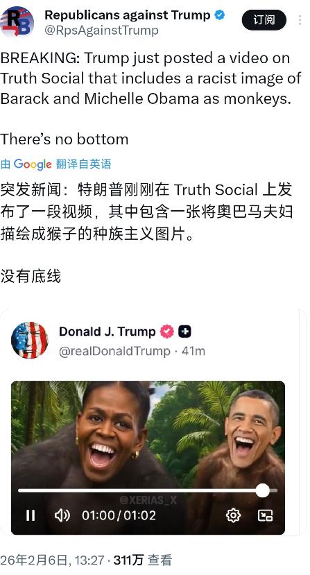 特朗普今天(北京时间2月6日)在社交媒体上发布了一段视频,其中包含一张将奥巴马夫妇描绘成猴子的种族主义图片。 这条引发争议的视频,其实早在美东时间2月5日深夜就已经发出来了,特朗普的“真实社交”账号就是发布主体。视频里不光有其他内容,还特意剪辑了两个灵长类动物的画面,工作人员直接把奥巴马和米歇尔夫妇的笑脸,P到了这两个动物脸上,明眼人一看就知道是故意的。 可能有人会抬杠,说会不会是剪辑失误或者误会,这话真站不住脚。要知道,在美国社会里,把黑人比作猴子、猿猴之类的灵长类动物,从来都不是无意之举,而是赤裸裸的种族主义侮辱,这是长期以来形成的歧视惯例,特朗普作为前总统,不可能不知道这一点。 视频发出来之后,没等多久就炸锅了,各方的谴责声立马就涌了过来。最先表态的是共和党内部的资深参议员,连自己人都看不下去了。参议院唯一的非洲裔共和党籍参议员蒂姆·斯科特,直接在社交媒体上发文吐槽,说这是他见过白宫里最种族歧视的事情,还明确要求特朗普删掉视频。 密西西比州的共和党参议员罗杰·威克,态度也很明确,他直言这段视频的内容完全不可接受,不仅要求特朗普删帖,还呼吁特朗普出面道歉。要知道,这些人都是和特朗普同属一个党派的,能公开站出来批评,足以说明这事做得有多过分。 民主党方面的谴责就更强烈了。众议院民主党领袖哈基姆·杰弗里斯,直接呼吁所有共和党人站出来,谴责特朗普这种令人憎恶的偏执行为。加利福尼亚州州长、民主党人纽森,也毫不客气地表示,发布这样的视频就是一种卑鄙的行为。 除了两党人士,美国全国有色人种协进会主席德里克·约翰逊,也公开发表声明指责这件事。他明确表示,这段视频公然带有种族歧视色彩,既令人作呕,又极其卑鄙,还提醒大家,选民们都在关注这件事,后续投票时一定会记住特朗普的所作所为。 面对铺天盖地的批评,白宫方面的态度一开始特别强硬。白宫新闻秘书莱维特率先出来辩解,说这段视频是截取自一个保守派人士制作的网络视频,还找借口称视频里特朗普被描绘成丛林之王,民主党人只是被比作《狮子王》里的角色,让大家停止虚假的愤怒,多关注对美国公众有意义的事。 可这种辩解根本没人买账,谴责声不仅没减少,反而越来越大。紧接着,白宫就松口了,一名高级官员在6日中午对媒体表示,这条视频是白宫一名雇员误发的,目前已经被删除。从视频发布到删除,整整过去了10多个小时,很难让人相信这真的只是一次误发。 更让人无语的是特朗普本人的回应,当地时间2月6日,有记者追问他这件事,他直言自己只看了视频的前半部分,没看到后面冒犯人的内容,还把责任推给工作人员,说自己以为工作人员会看完再发布。记者问他会不会道歉,他直接拒绝,还嘴硬说自己没有犯错。 其实熟悉特朗普的人都知道,这并不是他第一次被指控种族主义。早在上台之前,他就曾质疑奥巴马不是在美国出生的,变相否定奥巴马的总统合法性。发起总统竞选时,他还公开称墨西哥移民是强奸犯,言论极其极端。 之前他还曾在电视直播的内阁会议上,把明尼苏达州的索马里裔移民称为垃圾,甚至说要把他们遣返回去,当时副总统万斯还当场表示赞同。还有一次闭门会议上,他更是把海地和部分非洲国家称为粪坑国家,质疑美国为什么要接收这些国家的移民。 有人可能会说,特朗普这些言论只是为了博眼球、拉选票,可不管他的目的是什么,这种带有种族歧视的言论和行为,都已经伤害到了少数族裔群体,也加剧了美国社会的分裂。美国本身就是一个多种族国家,种族歧视问题一直根深蒂固,而作为前总统,特朗普的言行无疑会起到负面引导作用。 这次的视频事件,看似是一次误发,实则是特朗普种族主义倾向的又一次暴露。白宫的辩解、特朗普的嘴硬,都掩盖不了视频背后的歧视本质。说到底,种族主义从来都不是小事,尤其是对于一个国家的领导人来说,一言一行都影响着整个国家的风气,而特朗普的所作所为,显然没有尽到一个公众人物应有的责任。 目前视频已经被删除,但这件事带来的影响并没有消失,两党的分歧、民众的不满,都在进一步发酵。至于特朗普后续会不会有新的回应,我们还会持续关注,但无论如何,种族歧视都不应该被容忍,这一点是毋庸置疑的。