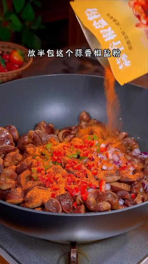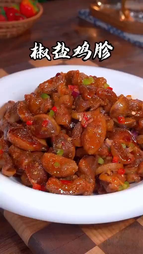 椒盐鸡胗。 大家注意看,把鸡胗放啤酒里泡一泡,出锅就是一道楼下饭店排队都要吃的特色美食,外酥里嫩,好吃到舔手指。 ·3块一斤的鸡肾对半切开后一分为四,把鸡肾先浸泡到啤酒里,因为啤酒中的蛋白酶可以软化肉质,这样做出来的鸡肾才会鲜嫩不柴。 ·碗中打入一个顺产的鸡蛋,搅匀打散。 ·泡好的鸡肾加姜、葱、蒜、一勺蚝油、一勺生抽、一勺生粉,爱干净的家人戴上黑色的手套,抓拌均匀后腌制10分钟。 ·油温6成热下锅炸,用中火慢炸7分钟,炸至金黄酥脆捞出来。 ·油热炒香大蒜末,放鸡肾下锅,加青红椒、洋葱粒。好吃的关键就是放半包蒜香椒盐粉,现在9块9有6袋,非常划算,用它做椒盐排骨、椒盐鸡翅都非常好吃。大火快速的翻炒均匀即可出锅。 这样做的椒盐鸡胗咸香入味,比外面买的还好吃。 喜欢你也点个赞,收藏做起来吧!