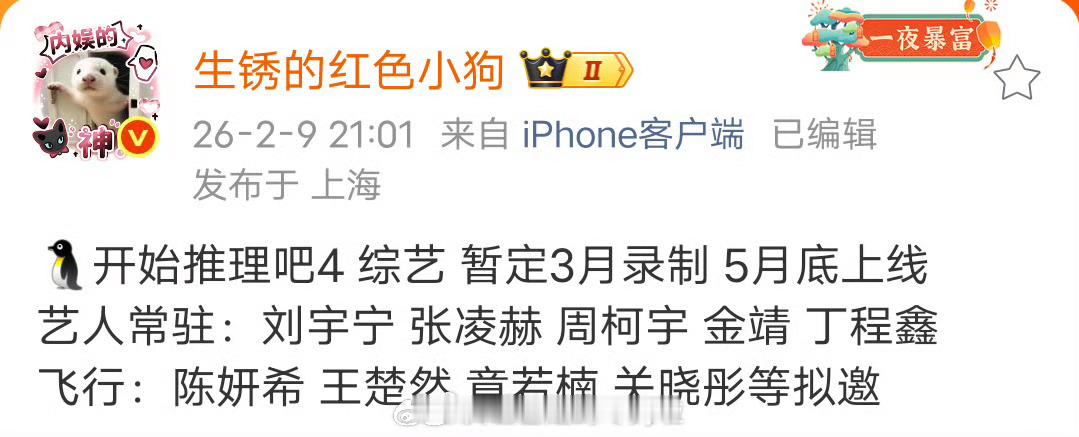 🍉网传综艺 开始推理吧4 ,艺人常驻:刘宇宁 张凌赫 周柯宇 金靖 丁程鑫