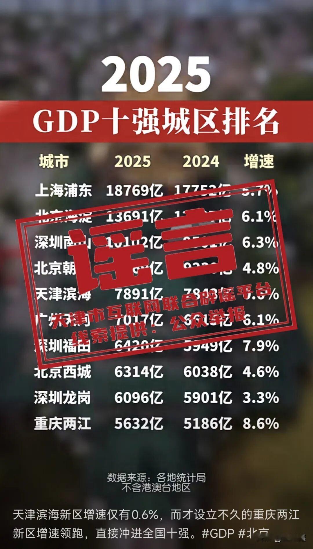 滨海新区GDP增速仅0.6%?官方紧急辟谣! 网传“天津滨海新区2025年GDP增速仅为0.6%”,引发网友热议。官方迅速辟谣:此为虚假信息!经核实,滨海新区2025年地区生产总值实际增长5%,固定资产投资增长5.7%,经济运行稳中有进、质效双升。工业、金融、服务业多点开花,重大项目建设加速推进,为高质量发展注入强劲动力。官方提醒:网络不是法外之地,不造谣、不信谣、不传谣,以官方权威发布为准。抵制网络谣言,共同维护清朗网络空间! 信息来源:中国互联网联合辟谣平台、腾讯新闻、网易新闻