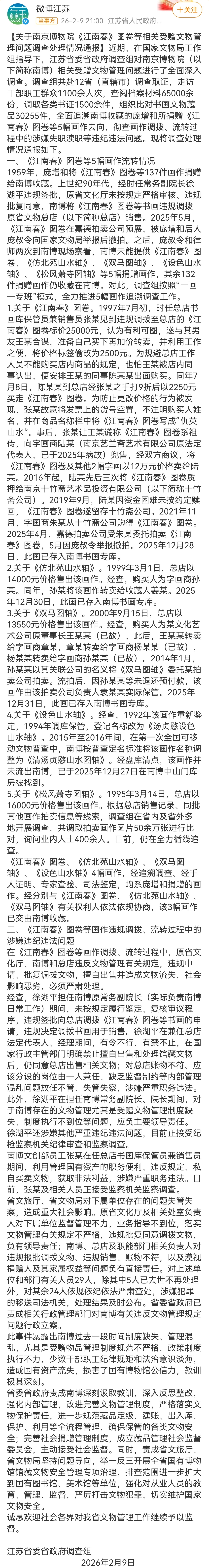 从官方通报来看,徐湖平还涉嫌其他严重违纪违法问题,其担任担任南京博物院常务副院长、院长的12年,正是庞增和捐赠文物被“剔除”调拨的关键时间段,才有了退休后住别墅的富贵生活。徐湖平2010年退休,15年后才落入法网,期间尽享各种滋润生活,引人深思,希望能以一反三、一查到底。南京博物院事件最新通报人民日报评南京博物院受赠文物事件