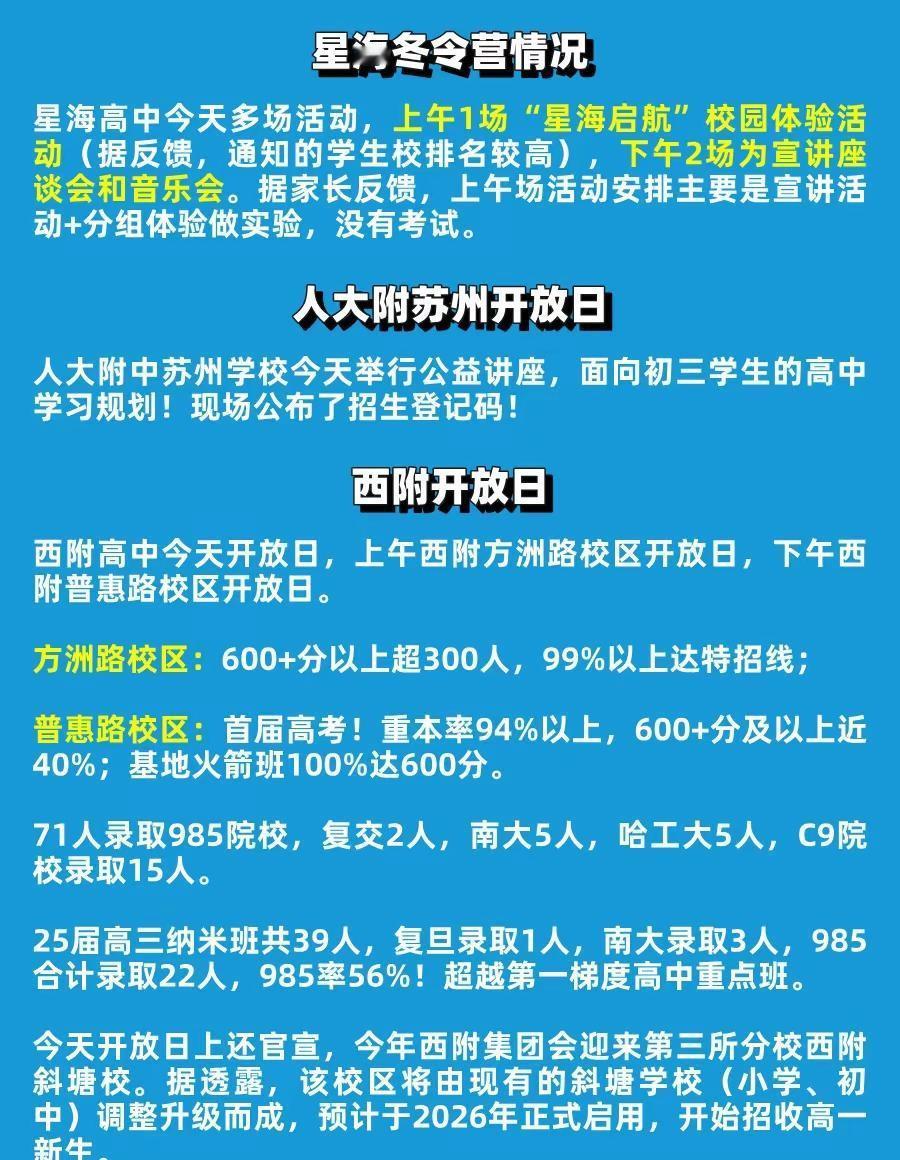 西附官宣新校区!星海、人大附中冬令营反馈。今天,星海、西附、人大附中以及相城中学贯通班相继举办冬令营活动;明天,木高也将开展相关安排,来看看今天上午的活动反馈吧! 中考签约 苏州初三 初三家长 苏州高中