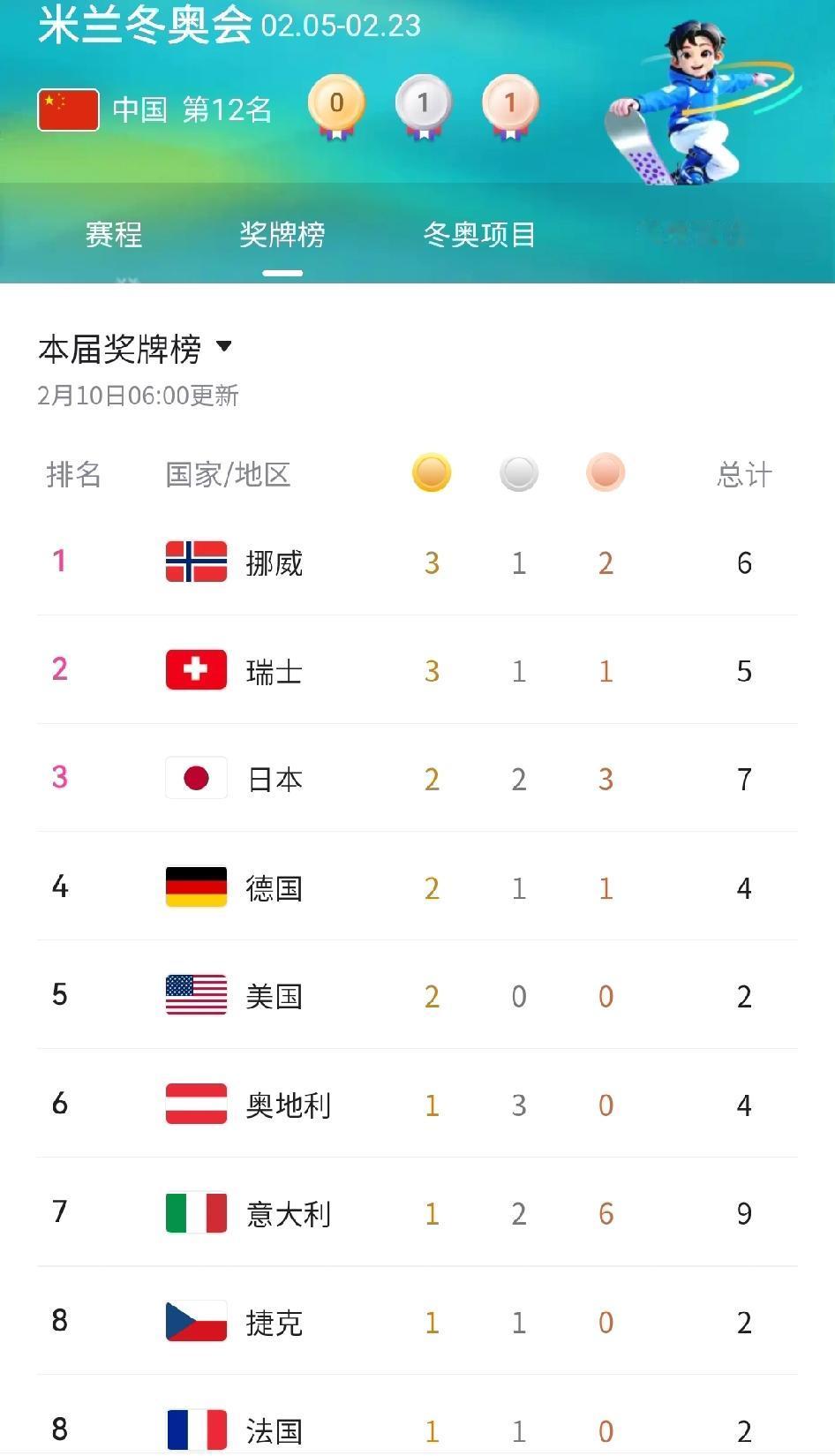 瑞士在第三比赛日大爆发,夺得2金1银1铜,增加4块奖牌,在奖牌榜上从昨天的第10飙升至第2,日本队表现也不错,获1金1银2铜,上升至第三,美国今天颗粒无收,下滑至第5,中国第12。 今天,瑞士姑娘、卫冕冠军格雷莫德在自由式滑雪女子坡面障碍技巧赛以86.96的超高分赢得冠军,紧接着在整体实力雄厚的高山滑雪男子团体全能项目上,瑞士更是包揽冠亚军,可谓是今天赛场最大赢家。村濑心椛为日本赢得单板滑雪女子大跳台的金牌,高木美帆、二阶堂任分别在速度滑冰女子1000米和跳台滑雪男子个人标准台摘得一枚铜牌,另外日本今天获得花样滑冰团体赛银牌。