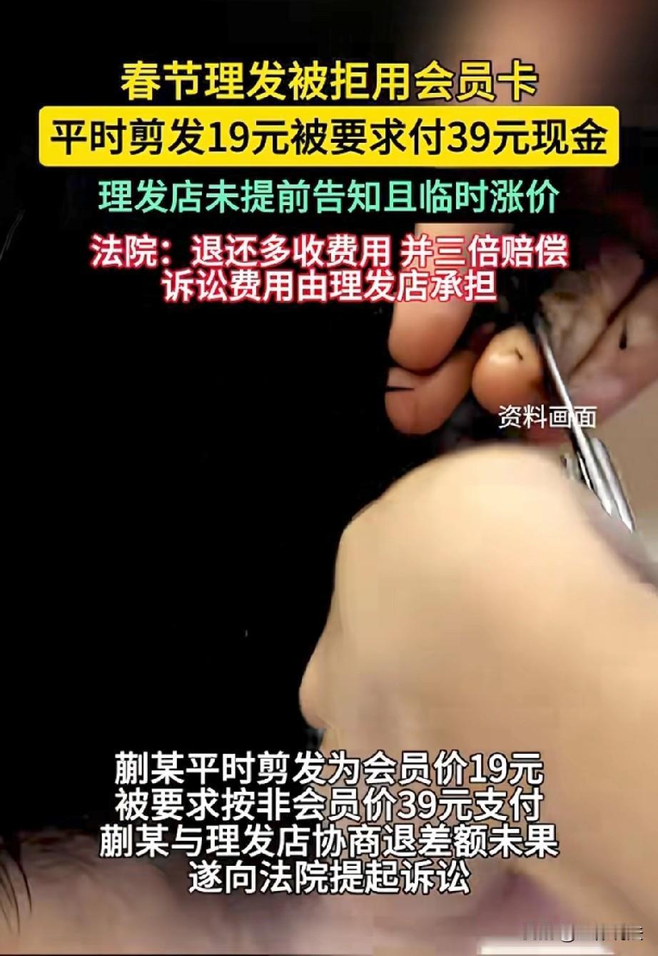 不惯你这臭毛病!山东菏泽,春节期间,男子去理发店理发,谁知,老板却以“系统升级”为由,表示不能使用会员卡,平时会员价理发19元,却要求他支付39元。老板没有通知却临时涨价,这明显属于欺诈消费者,男子很生气,最后,他同意支付39元,但要求老板退还20元差价。遭到拒绝后,男子一纸诉状将理发店告上法庭,法院的判决让人意外。 年关将近,蒯先生想着该理个发,清清爽爽、精精神神地迎接新年。 于是,他来到了小区门口那家自己经常光顾的理发店,他在这家店办了会员,图的就是方便和价格实惠,平常剪一次才19块钱。 推门进去,店里异常忙碌,好几个理发师都在忙,等候区也坐着人。 他等了好一会儿,终于排到他,理发师手脚麻利,很快就给他理好了。 发型利落了,蒯先生满意地对着镜子照了照,走到前台准备结账,他习惯性地老板报出了会员号。 谁知老板表示,店里会员系统最近在升级,这几天都用不了会员余额,得付现金或者扫码。 蒯先生愣了一下,不过没太往心里去,偶尔出点技术问题也正常,他表示这次就扫码支付。 谁知这时,老板竟报出价格39。蒯先生愣了一下,以为自己听错了,满脸疑惑的称,自己平时剪发会员价是19元。 老板回应说,平时是19元,但现在是春节期间,要按非会员的原价收费,就是39元。 一股火“噌”地一下就窜了上来,蒯先生他压着性子,尽量平静地表示,自己办会员的时候,可没说春节就要按原价收费。 卡里充的钱就是按19元一次扣的,现在说系统升级用不了卡,他接受现场支付,但应该还是按19元收现金,不能按39元收,这明摆着是涨价。 老板脸上挂着意味深长的笑容,摆出一副“行业惯例”的表情,称过年期间大家都忙成什么样了,从早站到晚,水都喝不上一口。 价格调整是店里规定的,人工、成本都涨了,多收一点也是应该的,大家都这样。 这解释蒯先生无法接受,大家怎么样自己不管,老板成本涨了要调价可以,但得提前通知顾客。 自己剪发前,老板哪怕提一句“春节期间恢复原价”他都理解,但现在理完了才说,这不是玩“闷包”、宰客吗? 他越说越气,感觉自己作为老顾客的信任被利用了。 他提出,这39元可以先付给老板,但得退自己20元差价。 老板表示不可能,过年期间都这个价,又不是针对他一个人。 蒯先生知道再争论下去也是徒劳,店里人多,他不想再纠缠,支付了39元便离开了。 钱虽然付了,但这事没完,他始终认为老板这么做不合理也不合法。 这不是钱多钱少的问题,而是道理和权益的问题,这次他忍了,下次春节是不是还会这样,其他顾客是不是也被这样“套路”了。 一股较真的劲头涌了上来,随后,他就向法院提起诉讼,非要讨个说法。 审理过程中,法官查明所谓的“系统升级”只是说辞,店家为了在春节旺季多赚钱,人为暂停了会员结算功能,并单方面将价格临时调高了约200%。 对此,老板委屈地辩解,称大过年的,自己从头忙到尾,连口水都喝不上,多挣点不是天经地义吗? 是啊,别的行业节假日都是搞促销,但一个理发,一个洗车,这俩行业一到过节就涨价,这已经成了行业惯例。 说的好听是行业惯例,说白了其实就是行业乱象,大家也是懒得跟他们较真而已。 但是,法律并不支持这种“天经地义”。 《消费者权益保护法》第55条规定:经营者提供商品或者服务有欺诈行为的,应当按照消费者的要求增加赔偿其受到的损失,增加赔偿的金额为消费者购买商品的价款或者接受服务的费用的三倍;增加赔偿的金额不足五百元的,为五百元。 本案中,理发店以虚假“系统升级”为由人为暂停会员结算、未提前告知便单方大幅提价,属于故意隐瞒真实情况、误导消费者的消费欺诈。 同时,违反了预付式服务合同约定,侵害消费者公平交易权与知情权。 蒯先生办理会员卡即与店家成立合法有效的服务合同,店家无正当理由且未显著提前通知,擅自变更价格与会员使用规则,构成违约和欺诈双重违法。 最终,法院判决:理发店退蒯某多收的20元,并支付500元的赔偿金,并承担诉讼费用。