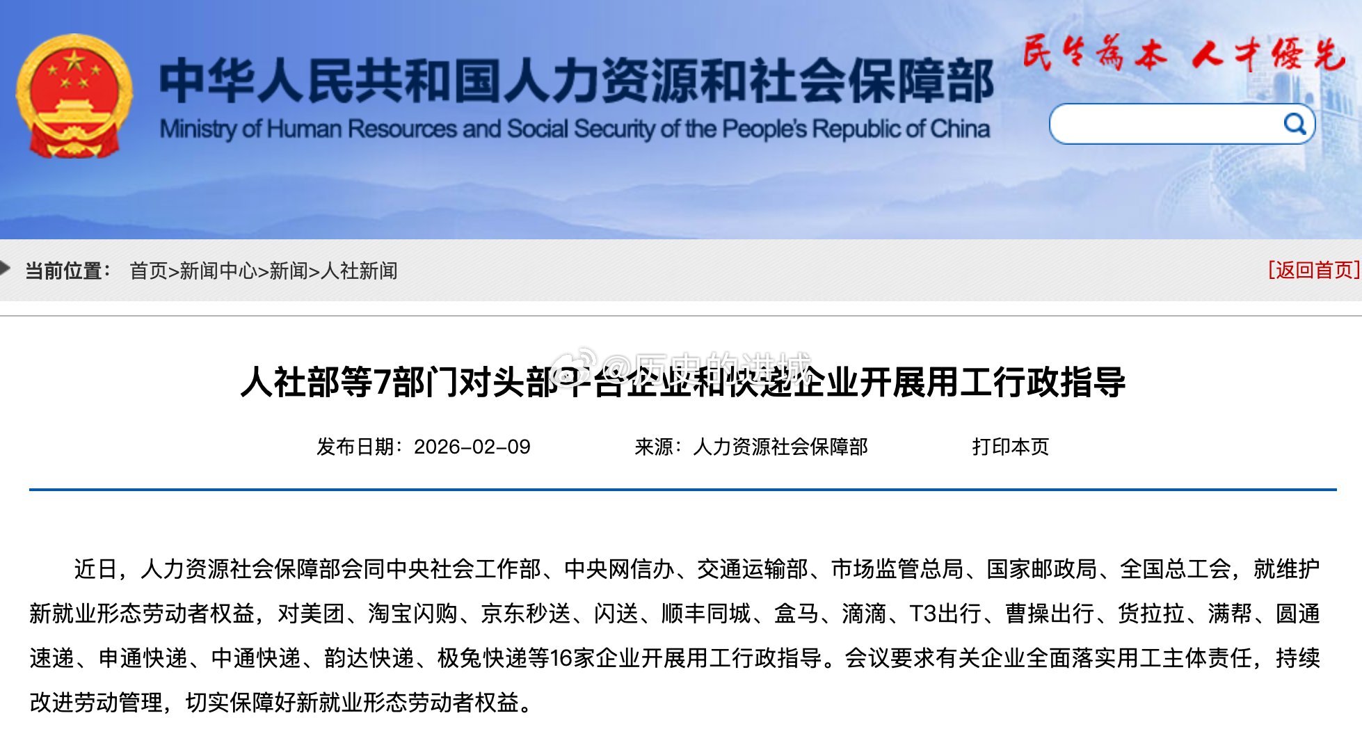 人社部:对美团、淘宝闪购、京东秒送、闪送、顺丰同城、盒马、滴滴、T3出行、曹操出行、货拉拉、满帮、圆通速递、申通快递、中通快递、韵达快递、极兔快递等16家企业开展用工行政指导。会议要求有关企业全面落实用工主体责任,持续改进劳动管理,切实保障好新就业形态劳动者权益。