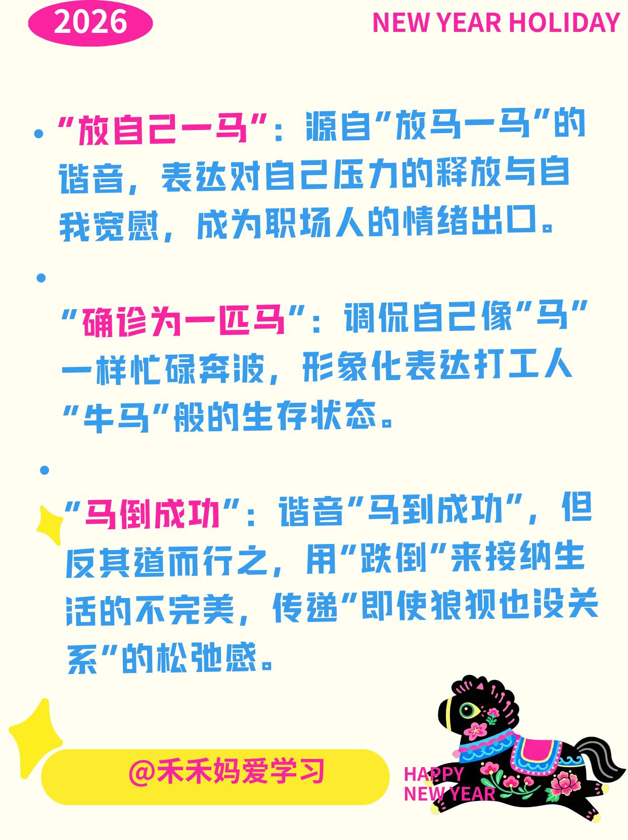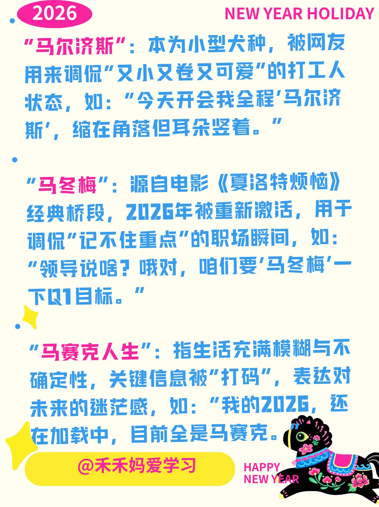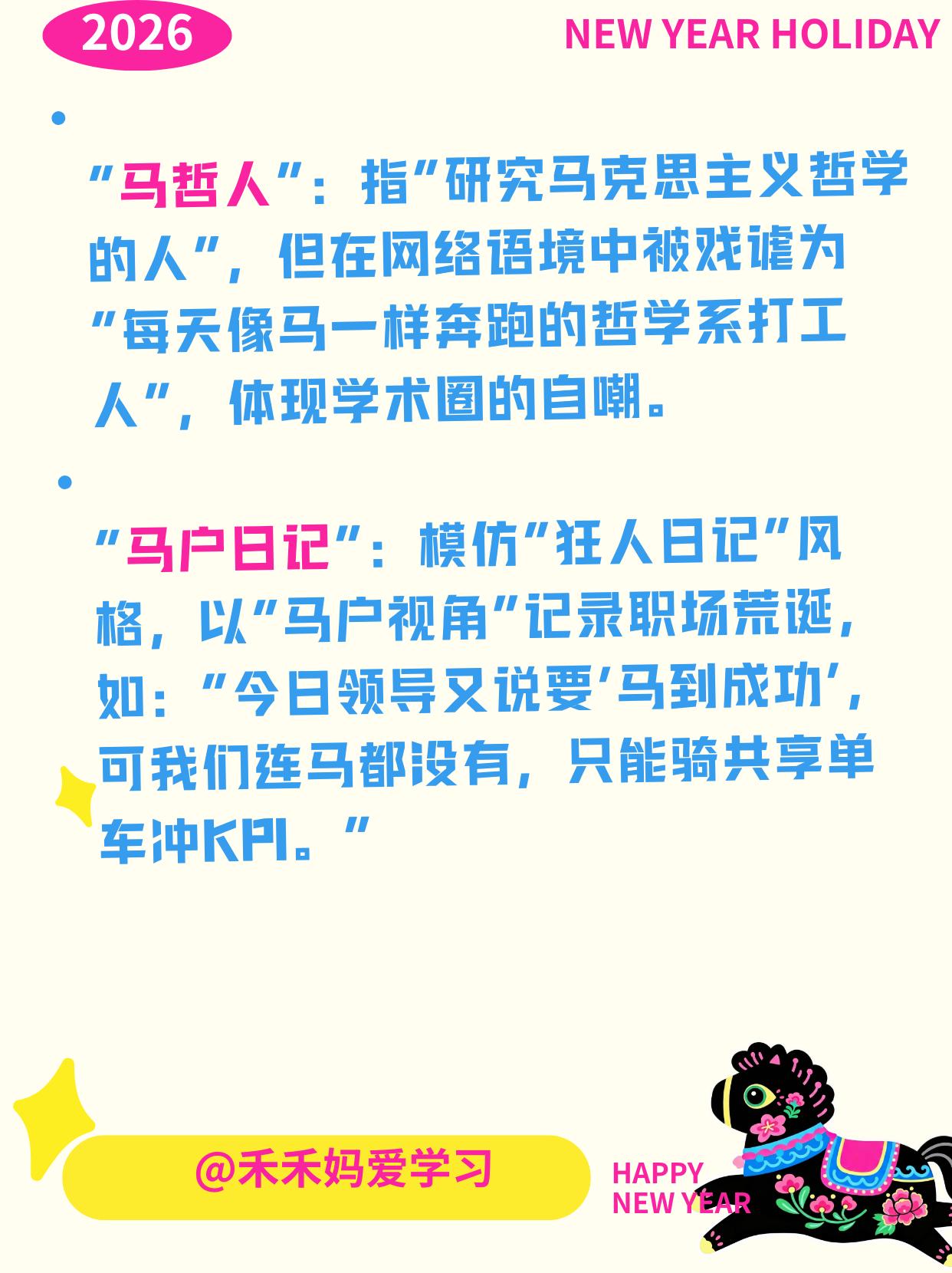 年味不仅是买年货、贴春联、守岁、拜年,随着经济、尤其是科技的发展,临近新年,崛起的网络热梗、热词,也是新年一道独特的风景线,是独属于现在社会的年味。 在传统文化里,马是深受老百姓喜爱的一种动物,因为它象征着进取,向上,可是在如今,网友们也赋予了马不同的含义,或缓解压力,或调侃自己。 比如,“白聋马”“班马”“卡急马”。 今天禾妈整理了一些独属于马年的网络热梗、热词,以及它们代表的意思,分享给大家。 还有几天就要过年了,大家聚在一起,难免会谈到这些内容,收藏了解一下,别到时候大家相谈甚欢的时候,你还不懂人家说的啥意思。