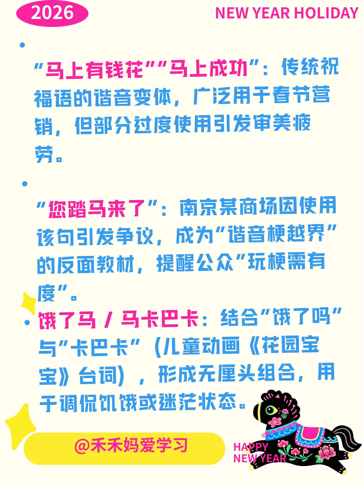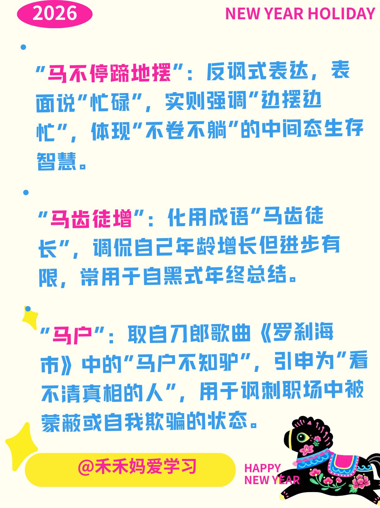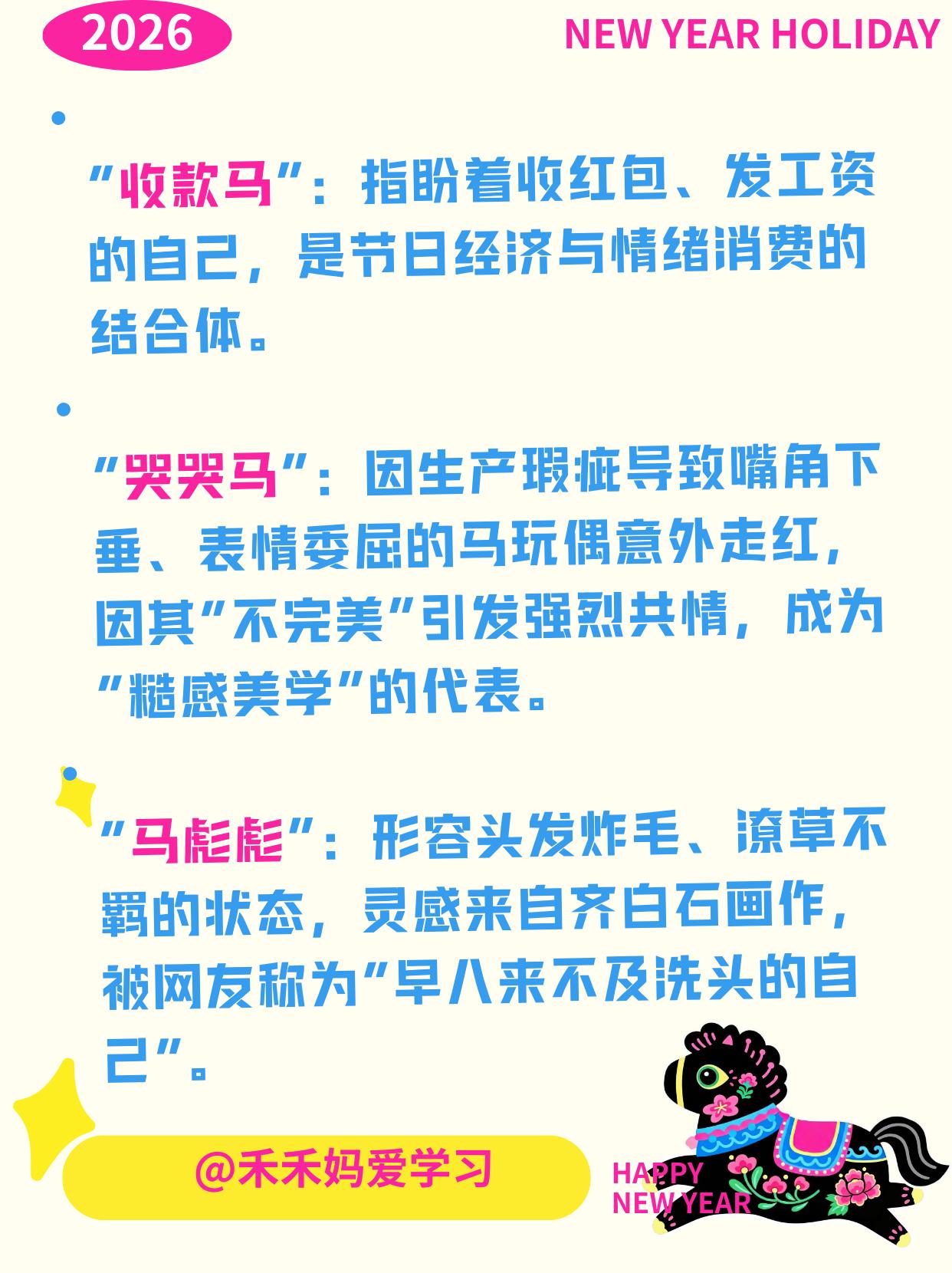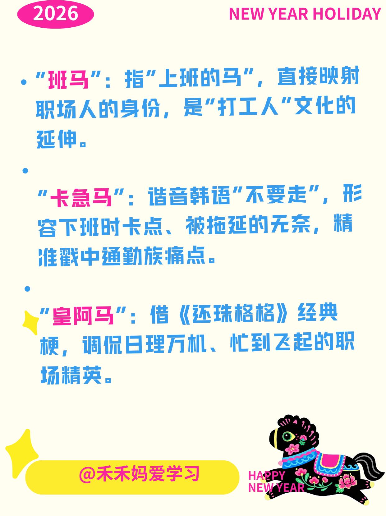 年味不仅是买年货、贴春联、守岁、拜年,随着经济、尤其是科技的发展,临近新年,崛起的网络热梗、热词,也是新年一道独特的风景线,是独属于现在社会的年味。 在传统文化里,马是深受老百姓喜爱的一种动物,因为它象征着进取,向上,可是在如今,网友们也赋予了马不同的含义,或缓解压力,或调侃自己。 比如,“白聋马”“班马”“卡急马”。 今天禾妈整理了一些独属于马年的网络热梗、热词,以及它们代表的意思,分享给大家。 还有几天就要过年了,大家聚在一起,难免会谈到这些内容,收藏了解一下,别到时候大家相谈甚欢的时候,你还不懂人家说的啥意思。