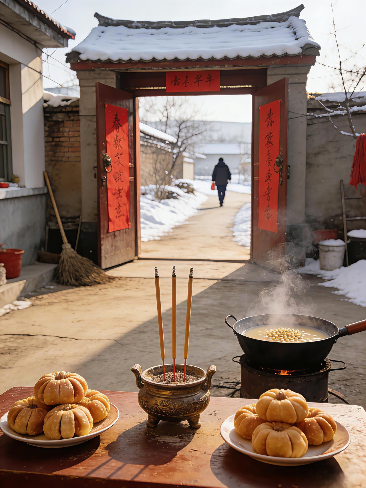 腊月廿三寒岁阑, 糖瓜甜润绕炉烟。 庭除扫净迎新岁, 黍粥温香袅屋椽。 传吉语, 祝平安, 红笺小字寄云端。 瑞雪催归人策马, 爆竹声中近大年。