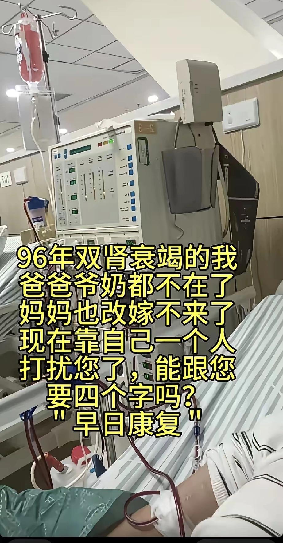 96年双肾衰竭的我,爸爸爷奶都不在了,妈妈也改嫁不来了,现在靠自己一个人,打扰您了,能给您要四个字吗?“早日康复” 敲下这段文字的是28岁的陈默,屏幕那头的他刚撑着虚弱的身体做完血液透析,胳膊上的内瘘针孔还贴着纱布,出租屋的小桌上只放着一碗凉透的白粥,这是他当天唯一的食物。 1996年出生的他,人生从没有享受过完整的家庭温情,五岁时爷爷因重病离世,八岁奶奶突发心梗撒手人寰,十四岁父亲遭遇工地意外永远离开,接连的亲人离去,让这个本就贫困的家庭彻底崩塌。 母亲扛不住接连的打击,在他十六岁那年改嫁到外省,起初还会偶尔寄点零花钱,后来组建了新的家庭,有了新的孩子,便彻底断了联系,陈默成了无依无靠的孤身一人。 成年后的他原本在市区打零工谋生,在餐馆端过盘子,在工地搬过砖块,想着靠自己的双手攒钱过日子,21岁那年突然出现全身浮肿、恶心乏力的症状,硬撑了半个月后去医院检查,双肾衰竭的诊断结果直接击碎了他所有的生活希望。 血液透析成了维持他生命的唯一方式,每周三次、每次四小时的治疗,不仅掏空了他所有的积蓄,还让他失去了稳定工作的可能。 他没有医保兜底,没有亲人资助,每一次透析的费用,都要靠他捡废品、做日结零工一点点凑齐,为了省下车费,他常常拖着病体步行一小时赶往医院。 他租住的是城中村顶楼的单间,月租仅两百六十元,没有空调没有暖气,夏天闷热难耐,冬天寒风从窗缝往里灌。 病友们大多有家人陪护,有人端水喂饭,有人彻夜守候,只有他永远是孤身一人,透析时昏沉睡去,醒来后自己收拾物品,自己走回出租屋,连递一杯热水的人都没有。 他不敢生病,不敢偷懒,更不敢有任何额外开销,每天的生活费控制在八元以内,白粥、馒头、咸菜是常年的主食,肉类对他而言是不敢奢望的东西。 他从未向陌生人索要过钱财或物资,不是不需要,是骨子里的倔强让他难以开口。刷到内容时他犹豫了整整两个小时,反复编辑文字又删除,最后只敢卑微地请求“早日康复”四个字。 这四个字对普通人而言是随口的祝福,对他来说却是支撑自己活下去的全部念想,是黑暗生活里唯一的微光。 他不奢求物质援助,不期盼亲人回归,只想要一句最朴素的祝愿,这份纯粹又卑微的请求,隔着屏幕都能让人鼻尖发酸。 生活的苦难没有磨掉他的善良,透析间隙他会帮行动不便的老年病友拿东西,会给新病友讲解透析注意事项,哪怕自己过得一地鸡毛,仍见不得旁人陷入难处。 他说自己没能力回报他人,只能做些力所能及的小事,这份通透与善良,和他遭遇的苦难形成了刺眼的对比。我们总在抱怨生活的琐碎,纠结工作的烦恼,却忘了有人在拼尽全力,只为能好好活着。 我当即回复了他“早日康复”四个字,还附上了几句鼓励的话语,消息发出后,内心久久无法平静。 陈默的遭遇不是个例,社会上还有很多像他一样重病缠身、无依无靠的年轻人,他们独自扛着病痛,独自面对生活的狂风暴雨,没有退路,没有依靠,只能咬牙硬撑。 他们不抱怨命运不公,不向生活低头妥协,哪怕只剩自己一人,也在努力维系着生命的微光。 他的懂事让人心疼,他的坚韧让人敬佩,不向外界索取过多,只渴求一句简单的祝福,这份微小的心愿里,藏着一个年轻人对生命最炽热的渴望。我们随手的一句善意,对身处绝境的人来说,或许就是撑下去的全部勇气。 生命从无高低贵贱,每一个努力活着的人都值得被温柔以待。一句简单的祝福或许无法治愈病痛,却能给孤独的灵魂带去温暖,让身处黑暗的人知道,这个世界从未将他抛弃。 各位读者你们怎么看?欢迎在评论区讨论。