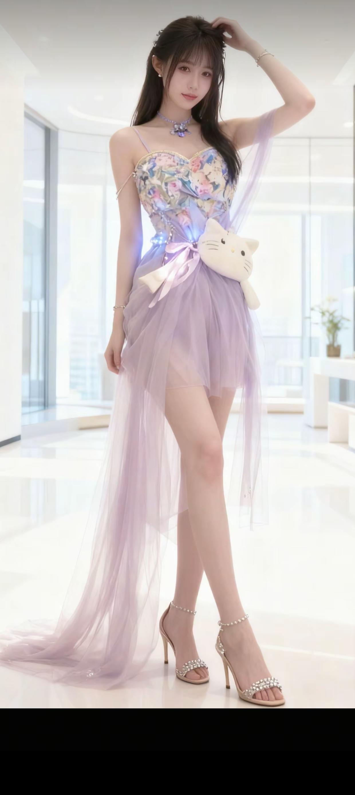 梦幻少女风,紫色裙摆飘逸,萌猫抱枕相伴,甜美可爱!💖🌸🐱