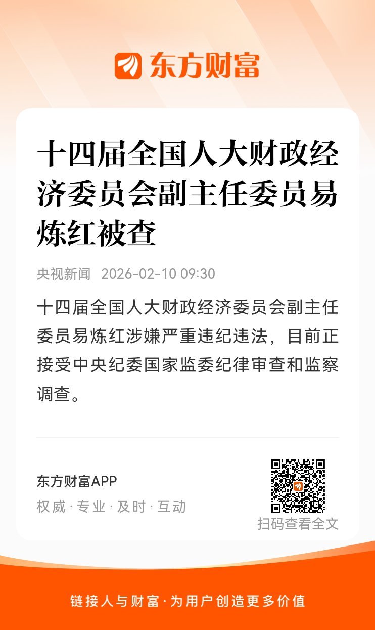 东方财富股票【十四届全国人大财政经济委员会副主任委员易炼红被查】十四届全国人大财政经济委员会副主任委员易炼红涉嫌严重违纪违法,目前正接受中央纪委国家监委纪律审查和监察调查。网页链接 (来自