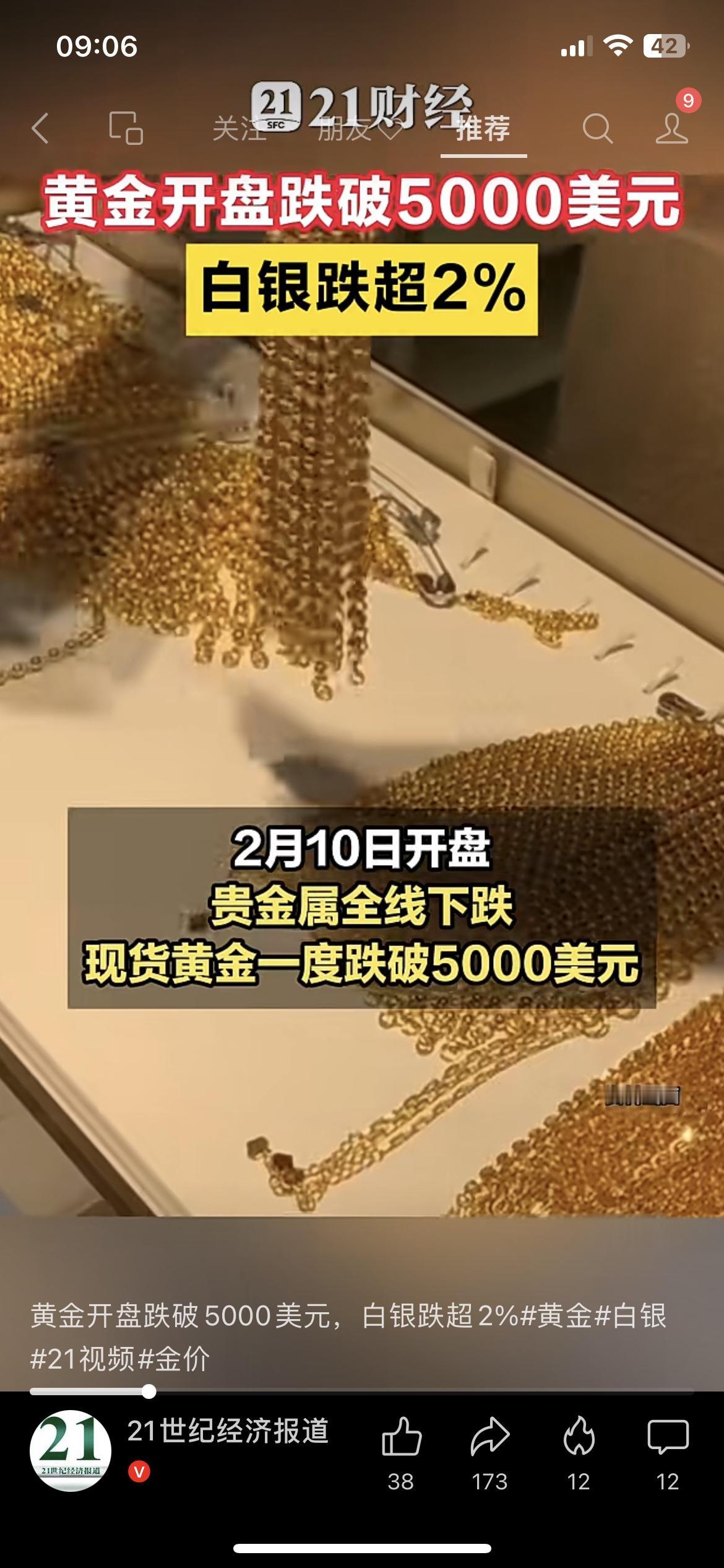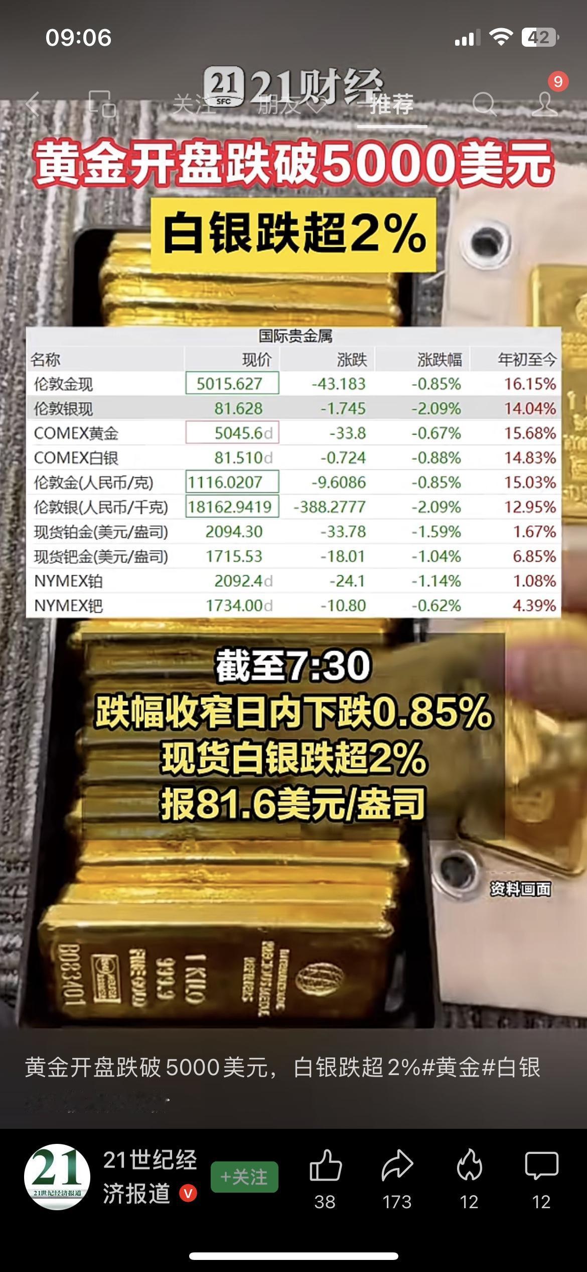 说实话,今早一睁眼直接吓一跳,黄金跌破5000美元,白银暴跌超2%,咱手里的金银基金又一片绿? 2月10日开盘,贵金属全线跳水,伦敦金现一度跌至5015美元附近,日内跌幅超0.8%,白银更是直接砸到81.6美元/盎司,跌幅超过2%。 不少朋友慌了:是不是要崩了?现在该不该割? 咱说实话,别乱操作。黄金这波连续涨了大半年,年初至今涨幅超16%,正常技术性回调,没必要自己吓自己。再加上美联储近期表态不会快速缩表,美元支撑不强,金银长期逻辑并没有坏。 给普通人一句实在话:别追高,别乱割。定投继续按计划走,重仓就分批减仓,千万别梭哈。 市场有风险,投资需谨慎。 你手里的金银基金现在亏还是赚?回调敢不敢补一点? 黄金 白银 贵金属