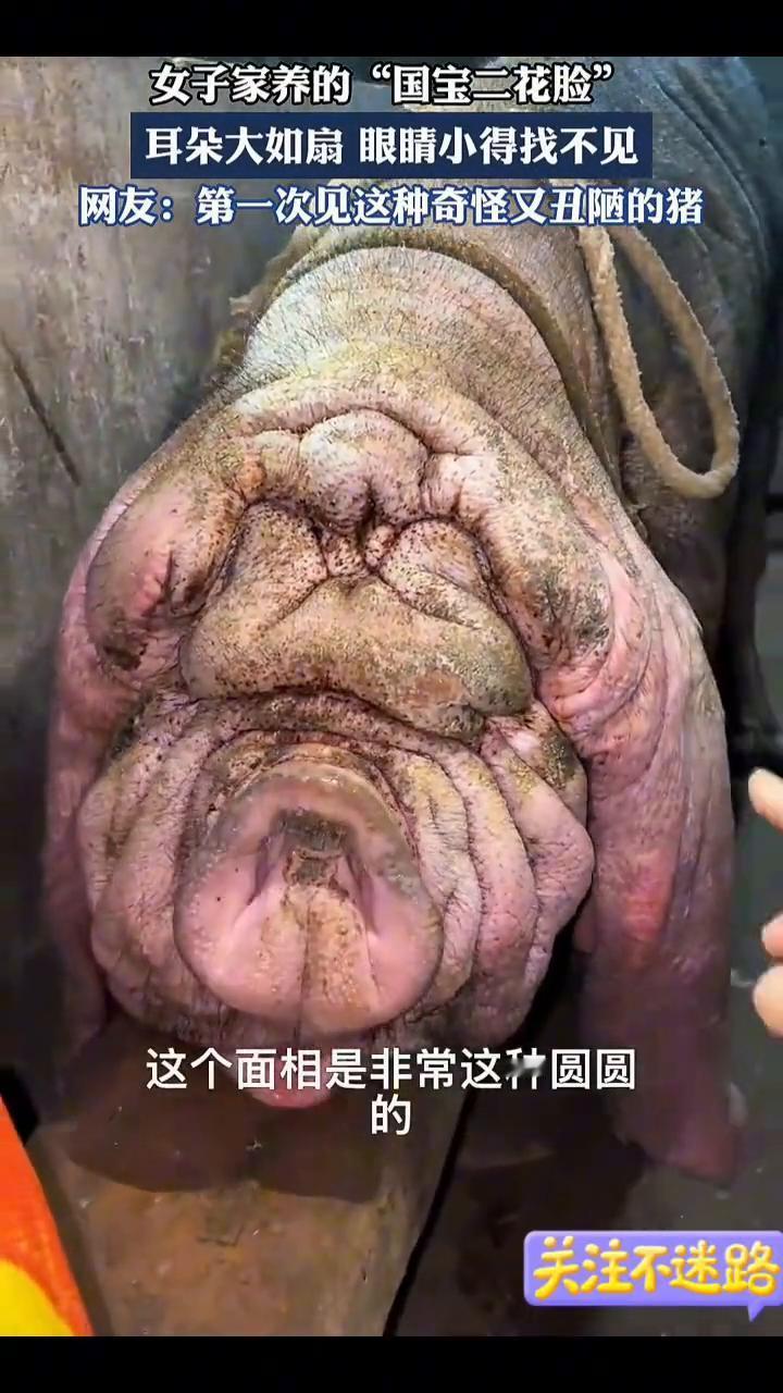 女子家养的"国宝二花脸",耳朵大如扇,眼睛小得找不见。 网友:第一次见这种奇怪又丑陋的猪。 2月9日重庆。你看这个猪,面相是非常圆圆的,然后它的眼睛在这个位置,这是它耳朵,耳朵以前小的时候眼睛是看得见的。