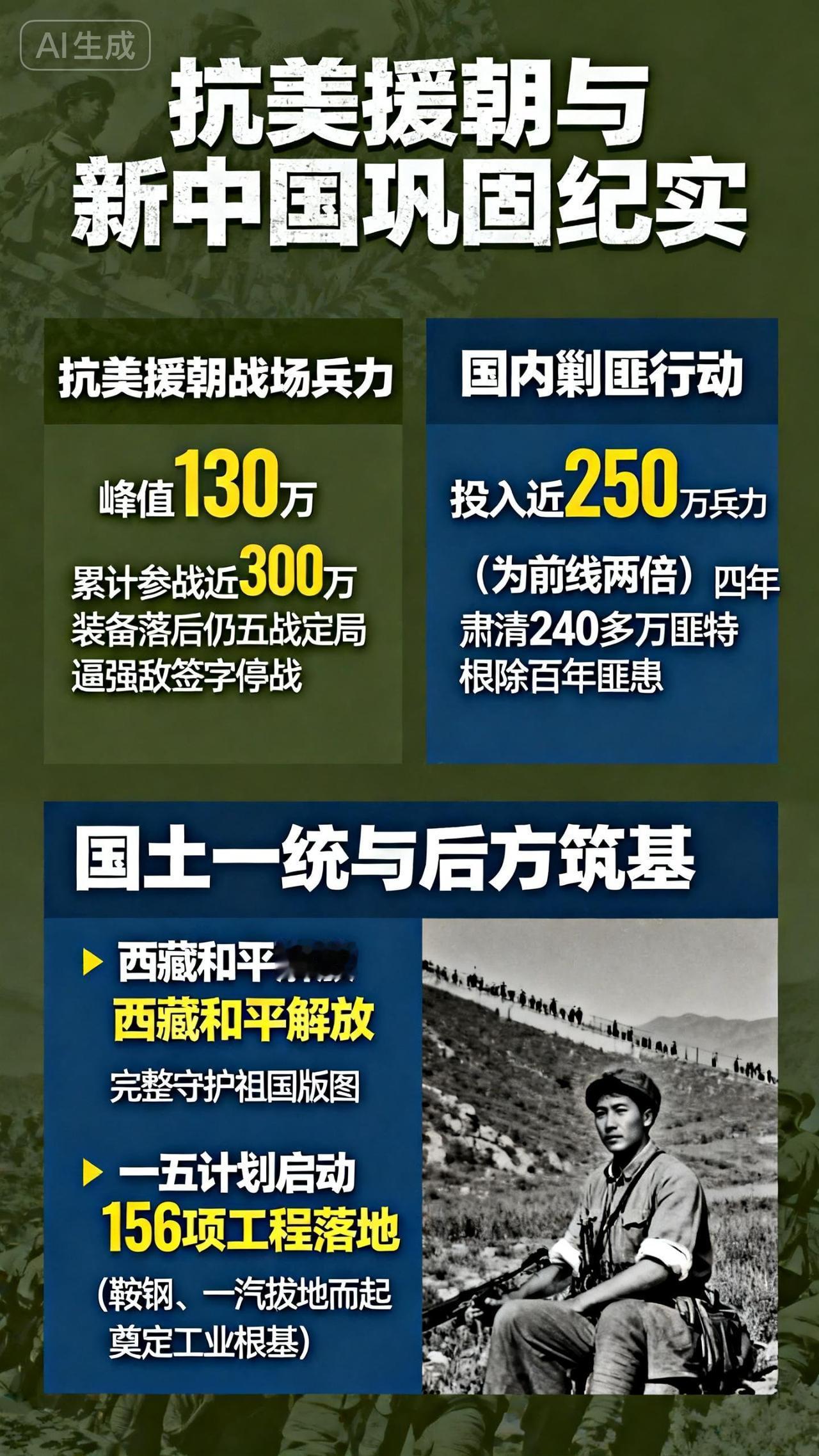 现在日本搞事的高市地位更稳了,大家别慌,我们有实力有底气,不怕它搞事,就是美日联手台独和菲猴一起上,甚至印度出个蹦达都没关系。大家看看开国最硬核操作!四线并进打天下,这才是我东大的大国底气! 兵家大忌是多线作战,可新中国刚成立就敢四线全开——抗美援朝、国内剿匪、解放西藏、工业奠基,件件是生死局,场场都打赢,这才是真正的立国之战! 很多人只知抗美援朝,却不知背后的兵力真相有多震撼。朝鲜战场我军峰值130万,累计参战近300万,装备落后仍五战定局,逼强敌签字停战。而同一时间,国内剿匪投入近250万兵力,是前线两倍,四年肃清240多万匪特,根除百年匪患。 前线御敌、内地清障、国土一统、后方筑基同步推进。西藏和平解放,完整守护祖国版图;一五计划启动,156项工程落地,鞍钢、一汽拔地而起,奠定工业根基。军民同心、前后同力,没有退路,只能全胜。 那段岁月,以一敌四、以弱胜强,用多线并进换来了长治久安。历史早已证明:中国的底气,从来都是拼出来、干出来、打出来的!向开国先辈致敬,这盛世如你所愿!搞事 高市早苗